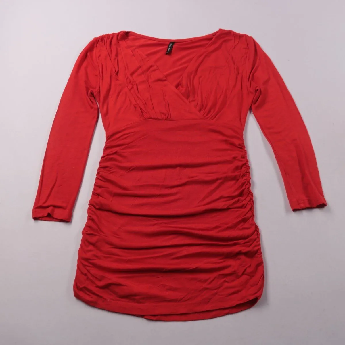 Повседневное платье Amisu красного цвета с V-образным запахом и длинным рукавом. Модель с драпировкой по бокам подойдёт для повседневных выходов и встреч. Эластичный трикотаж хорошо садится по фигуре и не сковывает движения.