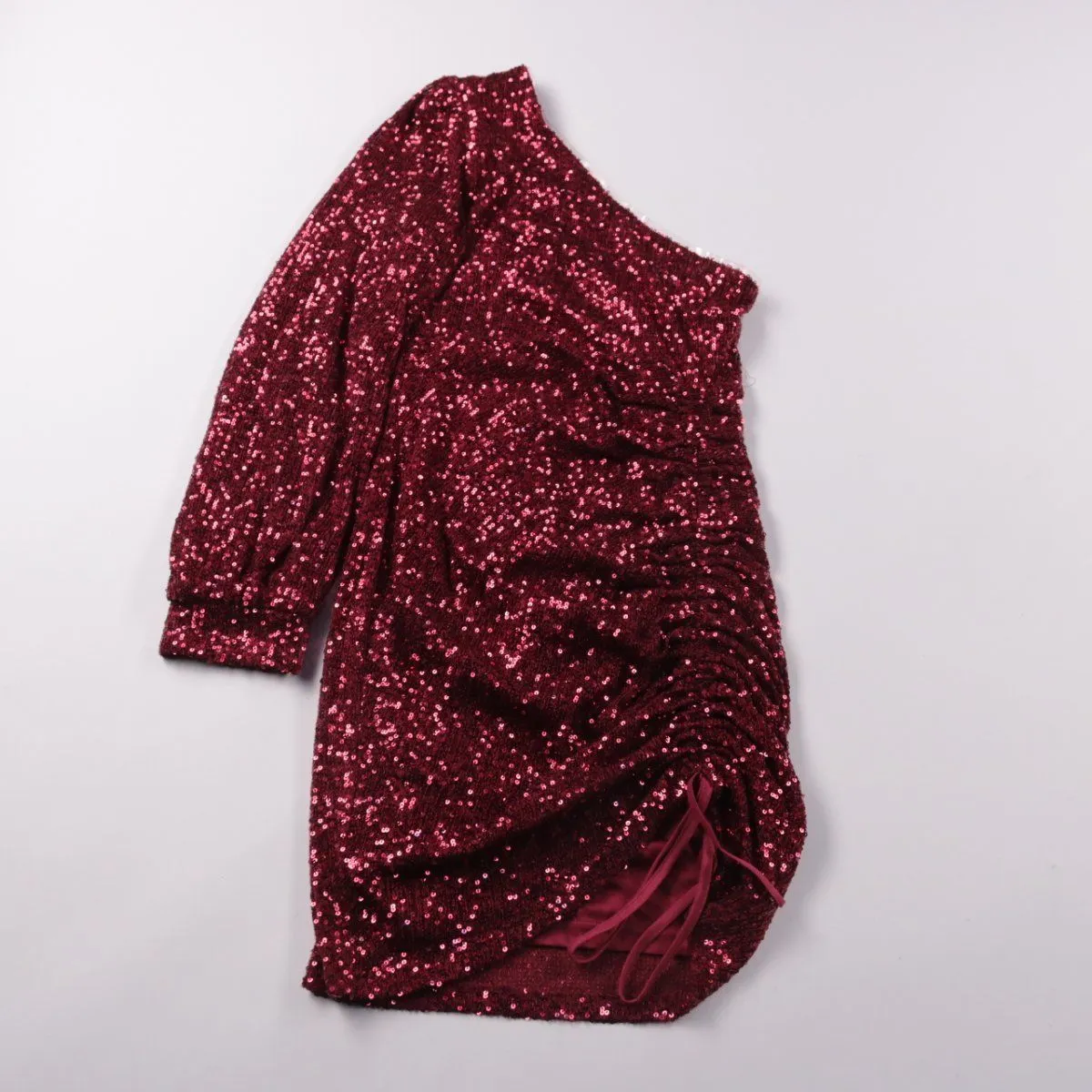 Вечернее платье Eight Paris в бордовом цвете, полностью покрыто пайетками и с асимметричным плечом на один рукав. Сборка и завязки сбоку добавляют акцент и позволяют чуть регулировать посадку. Подойдёт для вечеринки, праздника или выхода, эффектно смотрится на фото.