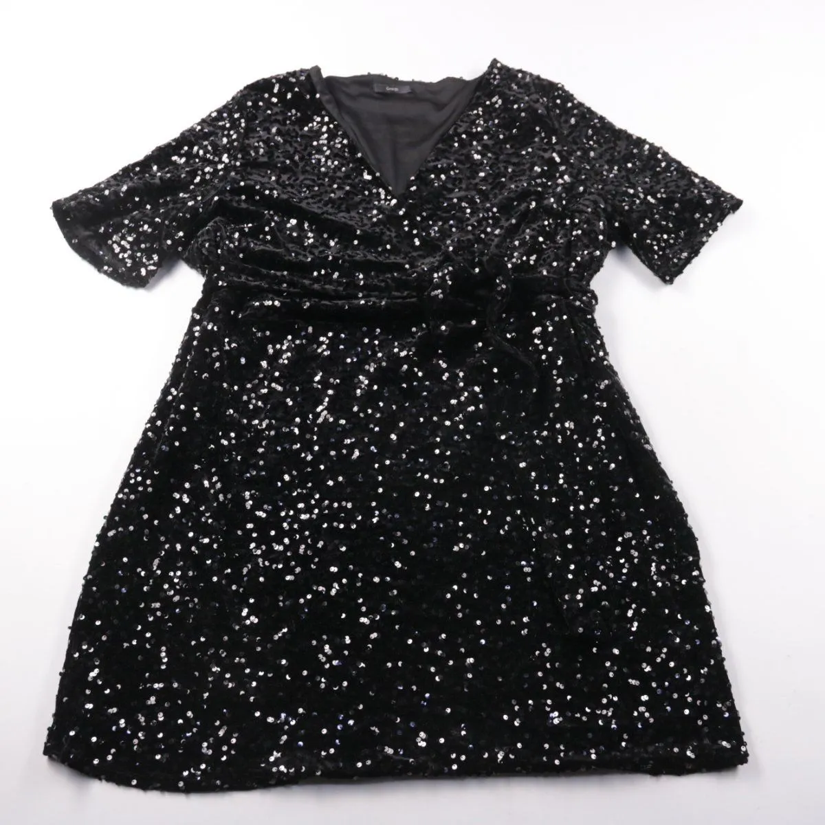 Вечернее платье George черного цвета, расшитое пайетками, с коротким рукавом и V-образным вырезом. Подойдет для праздника, вечернего выхода или торжественного мероприятия. За счет подкладки и эластичной ткани его удобнее носить в течение вечера.