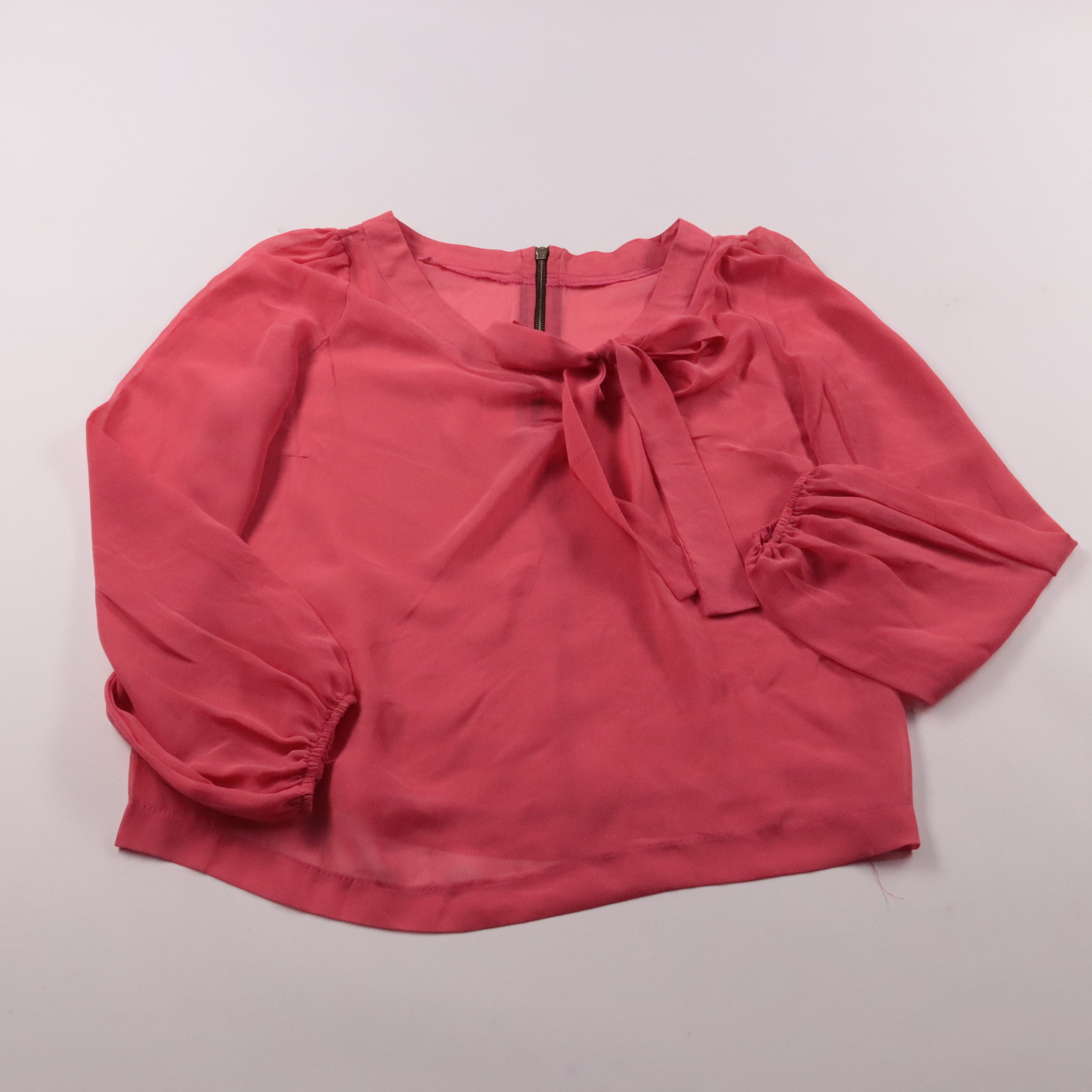 Розовая блузка из лёгкой полупрозрачной ткани с бантом у горловины и рукавами 3/4 на сборке. Подойдёт для офиса и выходов, хорошо сочетается с юбкой-карандашом или классическими брюками. Ткань мягко драпируется и почти не утяжеляет образ.