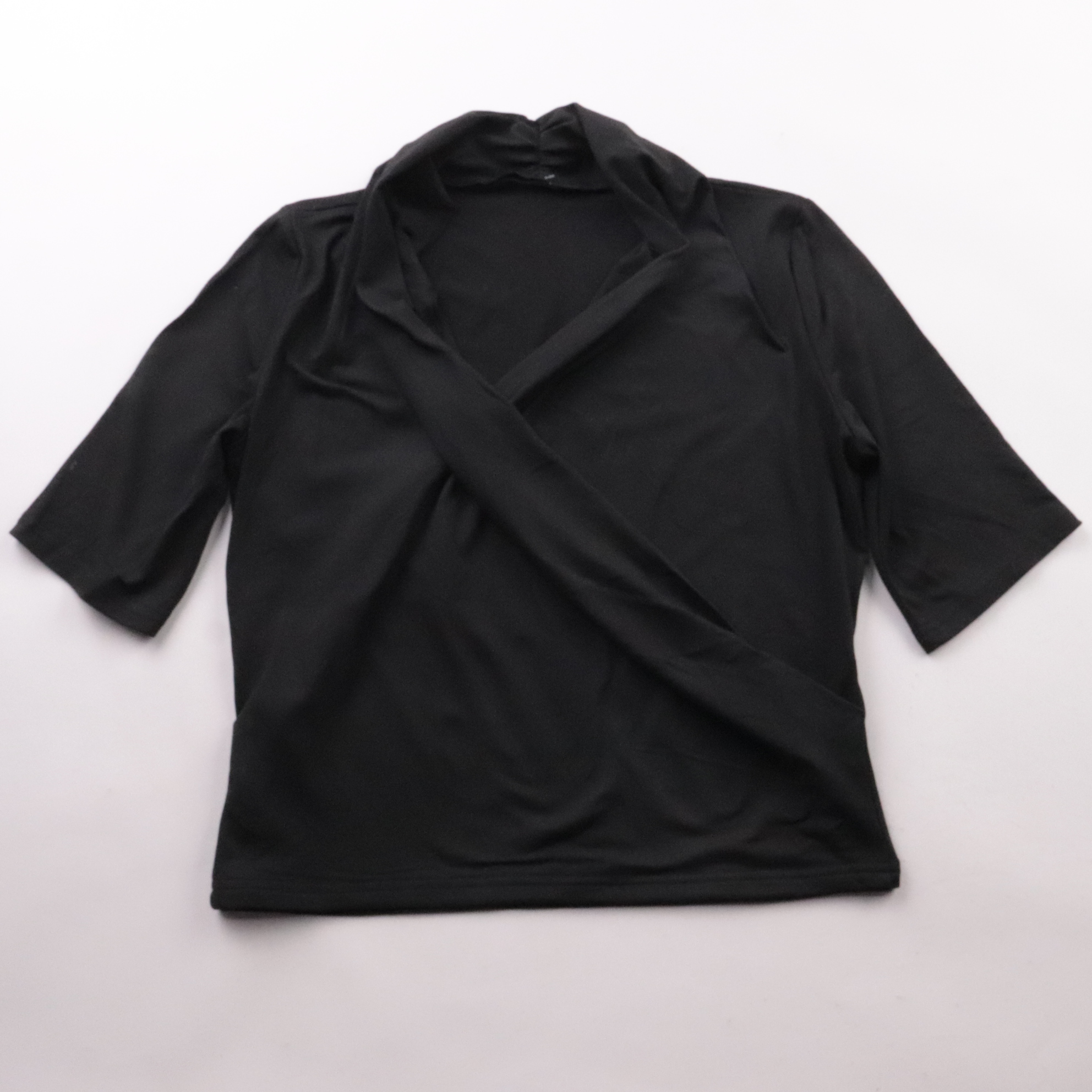 Чёрная блузка Shein с запахом и мягкой драпировкой, рукав 3/4. Подойдёт для офиса и вечерних выходов, легко сочетается с юбкой или брюками. Ткань тянется и комфортно сидит по фигуре.