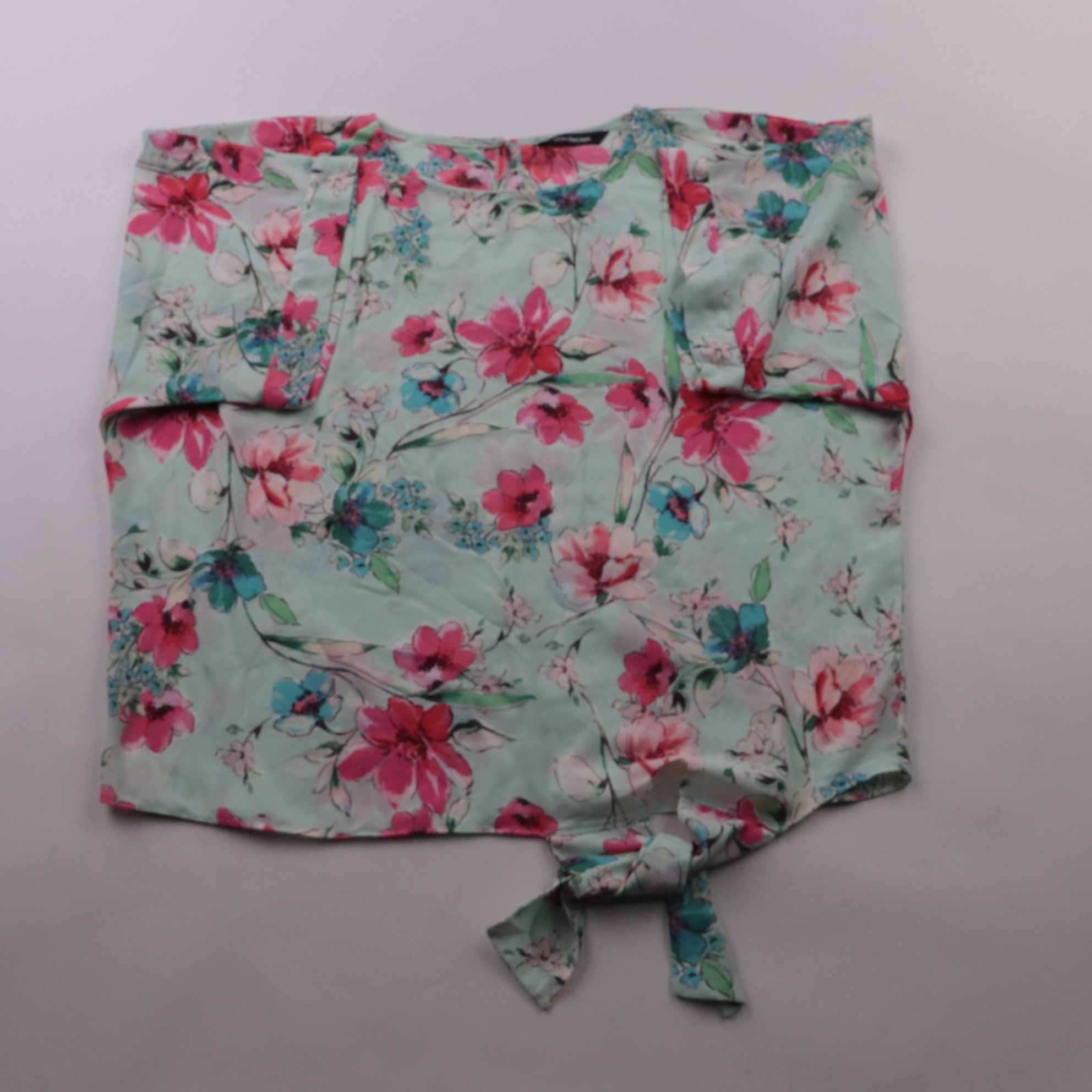 Лёгкая блузка Kaleidoscope мятного цвета с ярким цветочным принтом и коротким рукавом. Снизу завязывается на узел — удобно для прогулок, отпуска и повседневных летних образов. Ткань из полиэстера почти не мнётся и быстро сохнет.