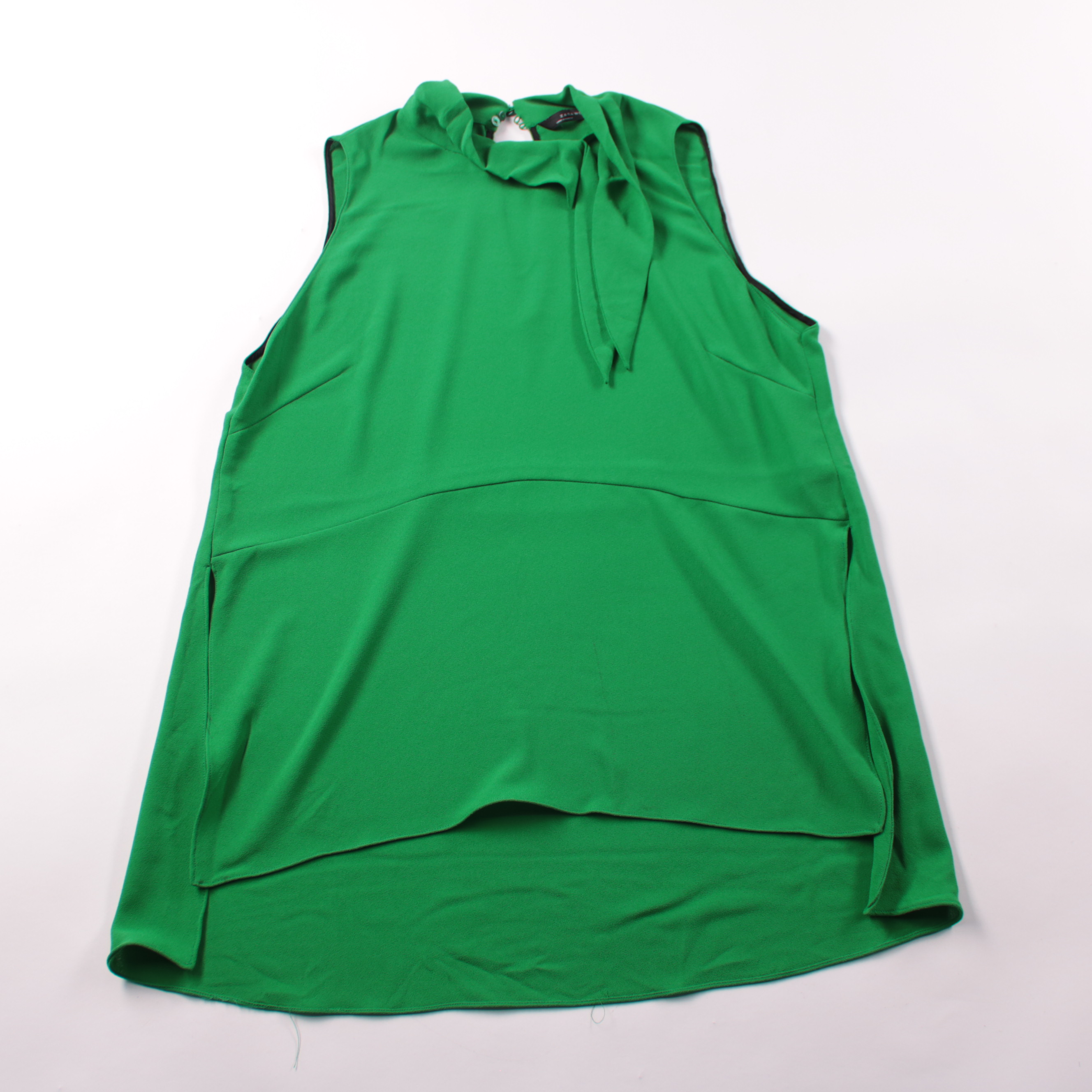 Зелёная блузка Zara Woman без рукавов, с воротником-бантом и удлинённой спинкой. Подойдёт для офиса и вечерних выходов, легко сочетается с брюками и юбками. Ткань из полиэстера почти не мнётся и быстро сохнет.
