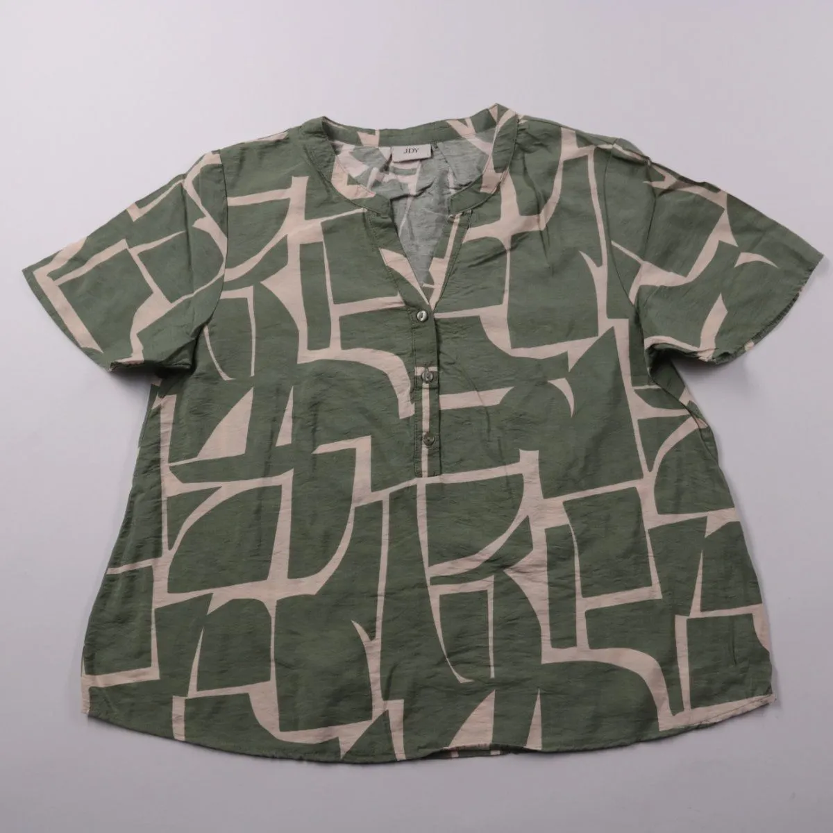 Лёгкая блузка JDY с коротким рукавом и абстрактным принтом в зелёно-бежевых тонах. Подойдёт для повседневных образов и офиса в тёплую погоду, хорошо сочетается с джинсами и однотонными брюками. Ткань мягкая и дышащая, быстро сохнет после стирки.