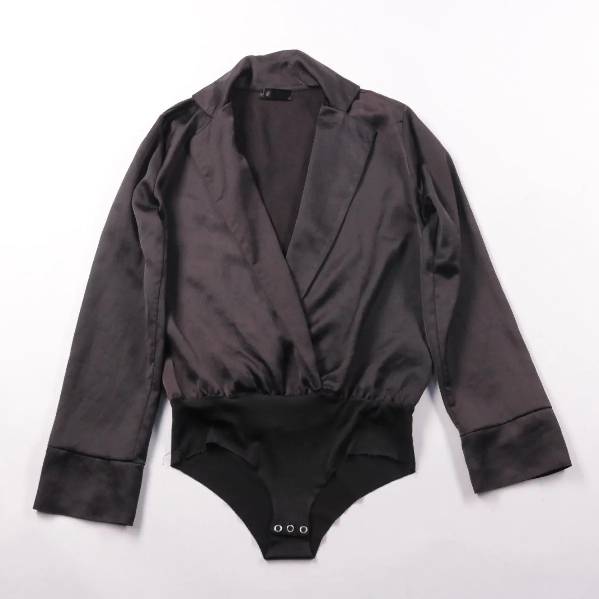 Блузка-боди с эффектом запаха и воротником-лацканом, выполнена в чёрном цвете. Подойдёт для офиса и вечерних выходов, хорошо смотрится с брюками и юбками с высокой посадкой. Практичный плюс — нижняя часть на кнопках, поэтому блузка не выбивается из одежды.