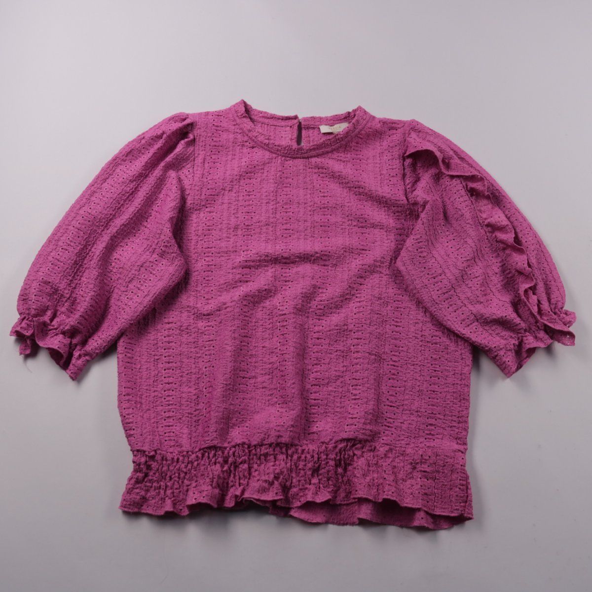 Женская блузка VER21A цвета фуксия из фактурной ткани с перфорацией (шитьё), с объёмными длинными рукавами. Подойдёт для летних прогулок и офиса в сочетании с джинсами или юбкой. Низ на эластичной сборке с рюшей — удобно садится по фигуре и не задирается.