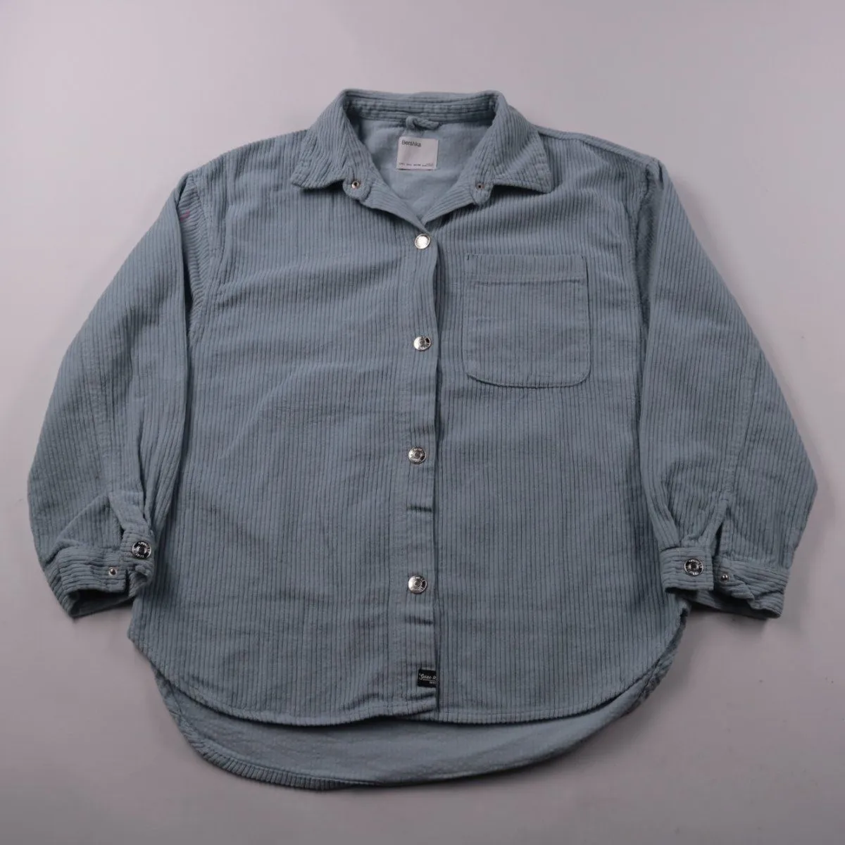 Женская рубашка Bershka из фактурного хлопка в пыльно-голубом цвете, с накладным карманом и застёжкой на пуговицы. Подойдёт для повседневных образов и как лёгкая верхняя рубашка в прохладную погоду. Натуральный материал хорошо дышит и комфортен в носке.