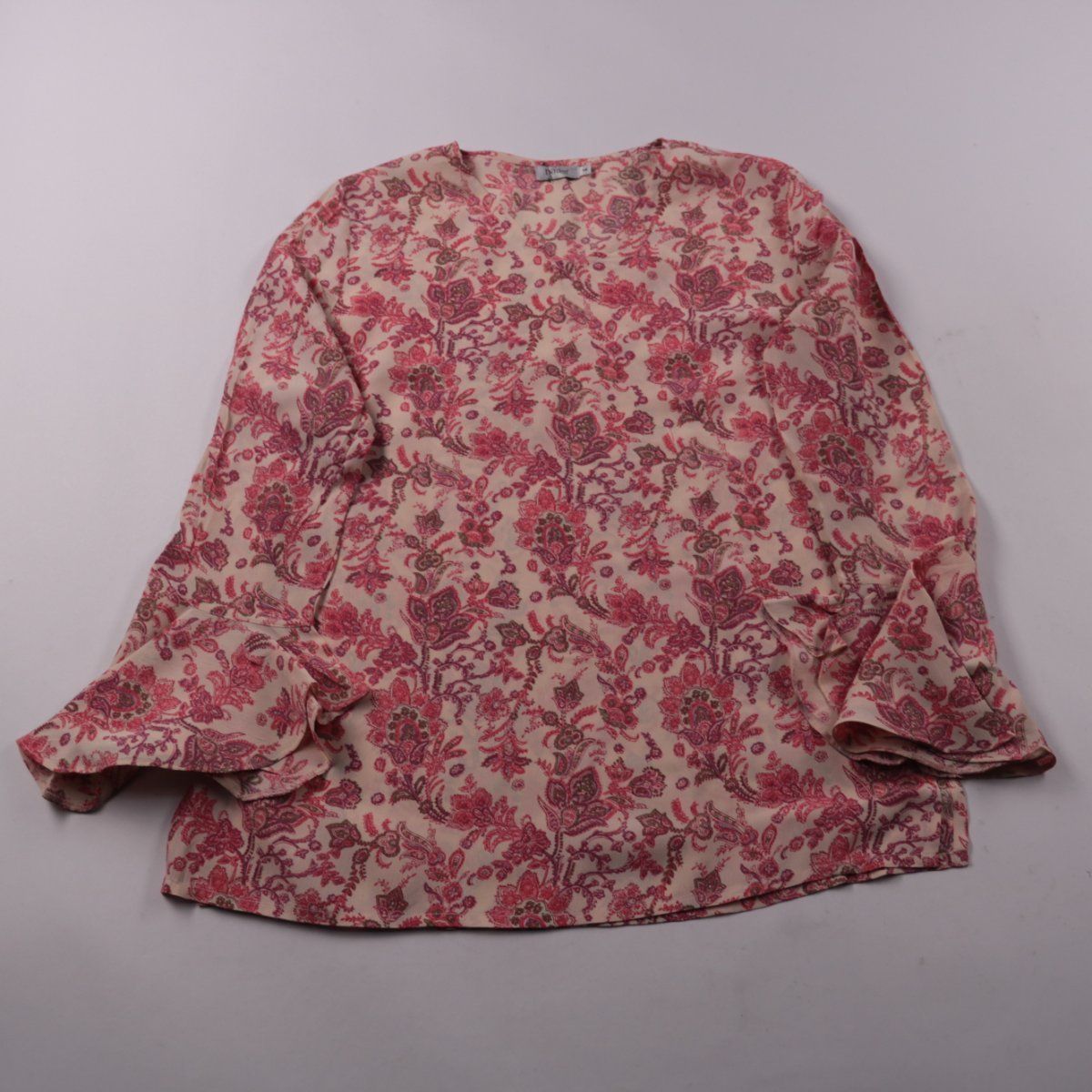 Блузка Bader из 100% вискозы, светлая с розовым цветочным принтом и длинными рукавами. Подойдёт для повседневных образов и офиса с жакетом или кардиганом. Вискоза хорошо дышит и приятна к телу.