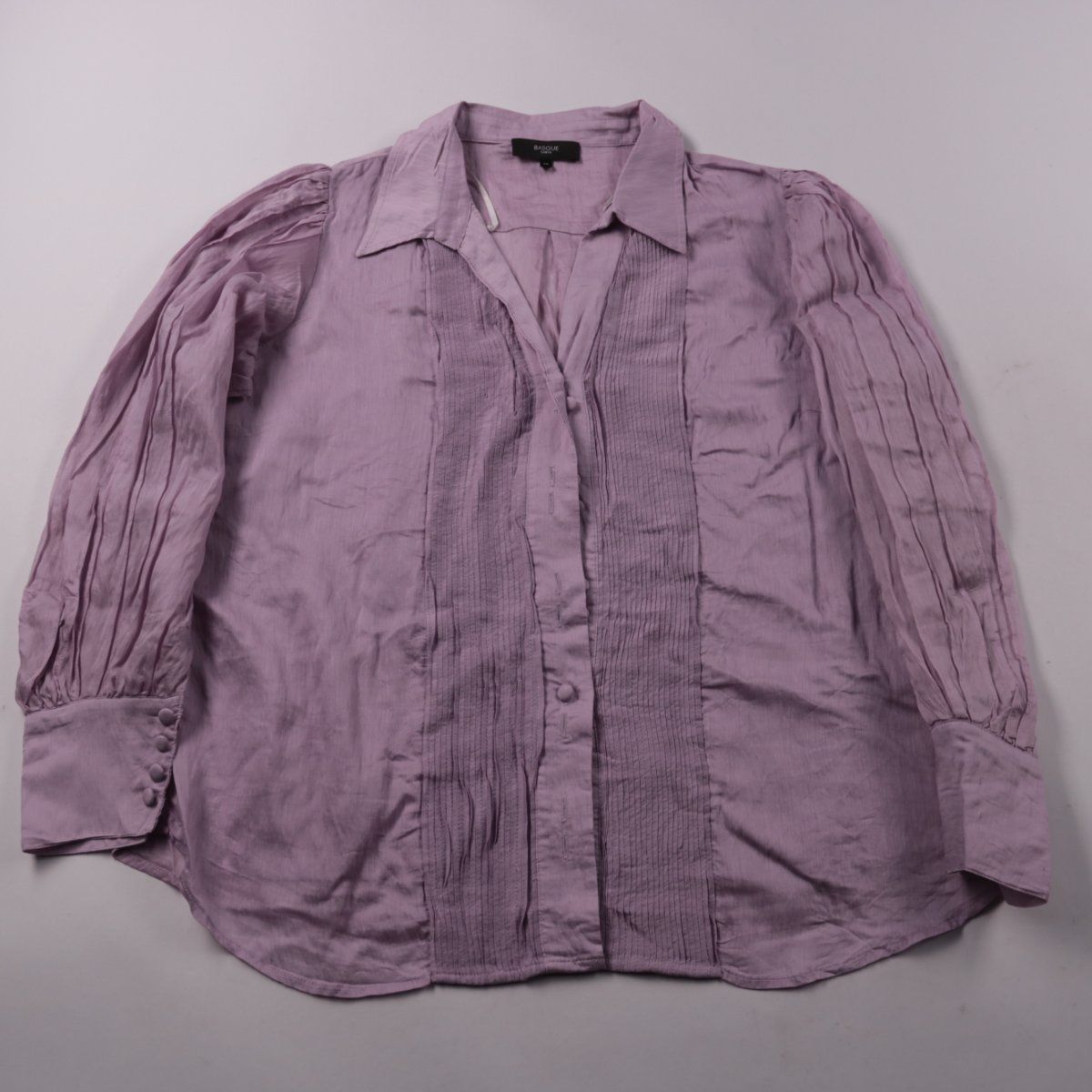 Блузка Basque Curve лилового цвета с декоративными защипами по переду и длинными рукавами с манжетами. Подойдёт для офиса и на каждый день, хорошо сочетается с джинсами и юбками. Лёгкая ткань и подкладка из вискозы делают посадку более комфортной.