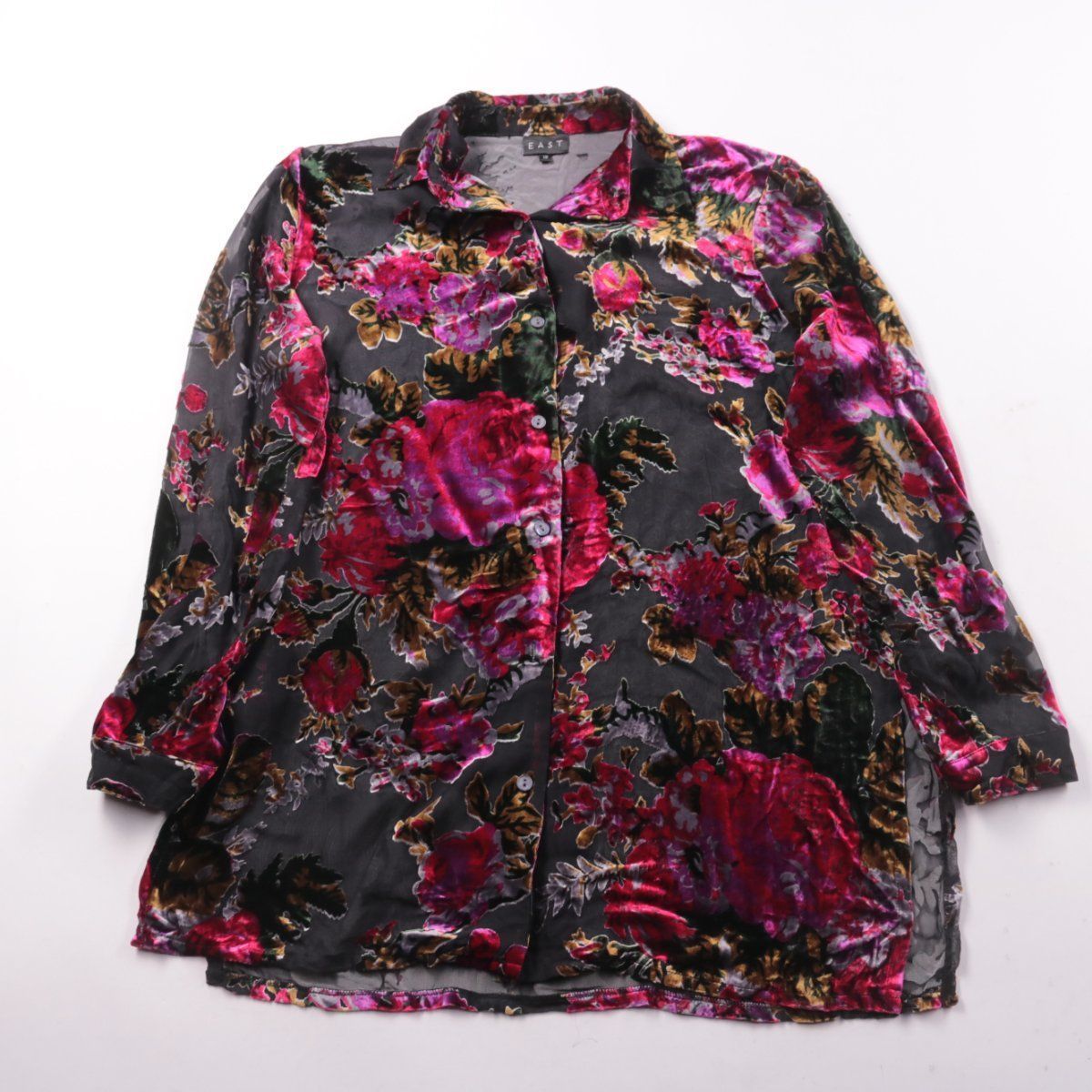Женская блузка East с цветочным принтом и эффектом «флок/бархат» на полупрозрачной ткани, застёжка на пуговицы. Подойдёт для повседневных образов и выхода, хорошо смотрится с однотонным низом. Практичный плюс — лёгкая и почти не мнётся.