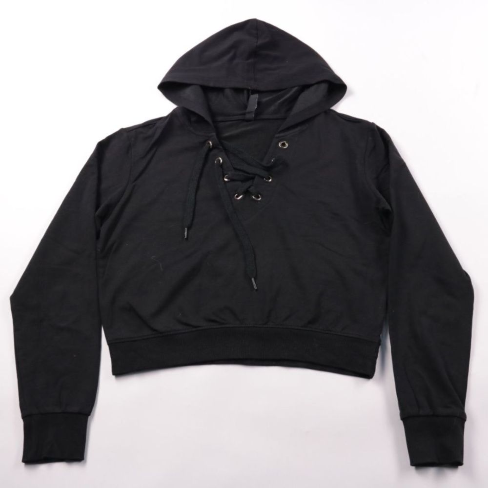 Чёрная укороченная толстовка Blind Date с капюшоном и шнуровкой на груди. Подойдёт для повседневных образов и прогулок в прохладную погоду, хорошо сочетается с джинсами и спортивными брюками. Эластичная ткань комфортно садится по фигуре и не стесняет д...