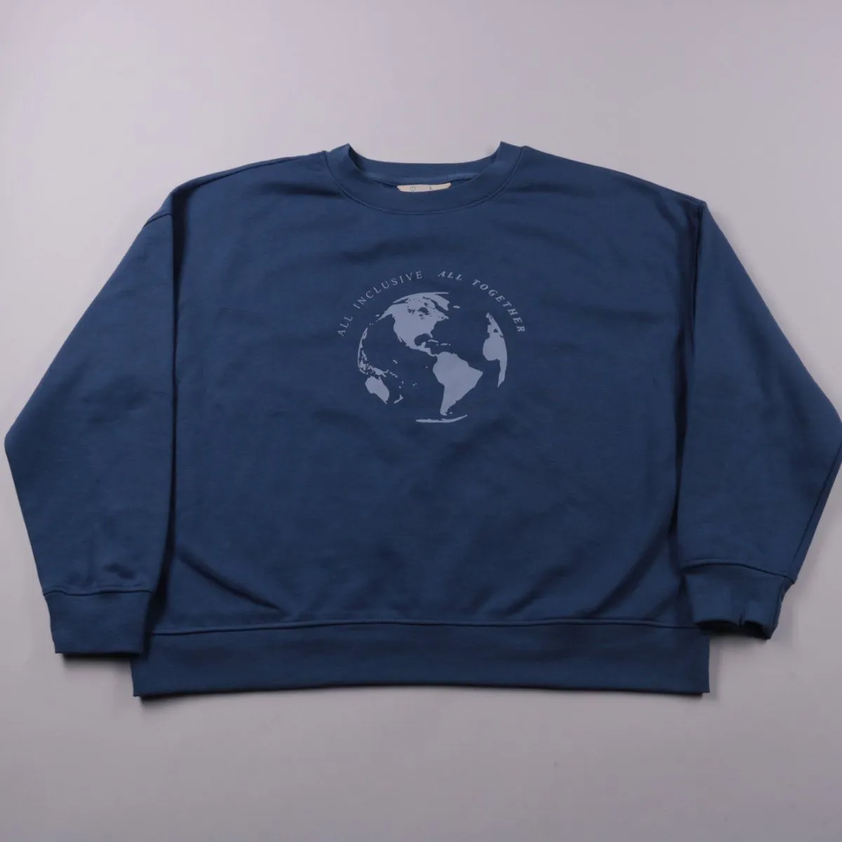 Свитшот Primark Cares синего цвета с принтом земного шара и надписью «All inclusive all together». Подойдёт для повседневных образов в прохладную погоду, хорошо сочетается с джинсами и спортивными брюками. Мягкий футер с добавлением полиэстера практичен и проще в уходе.