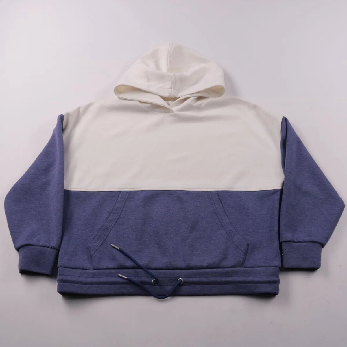 Толстовка Sfera с капюшоном и карманом-кенгуру, выполнена в двухцветном дизайне (молочный верх и кобальтово-синий низ). Подойдёт для повседневных образов и прогулок в прохладную погоду. Низ регулируется шнурком, что помогает лучше посадить по фигуре.