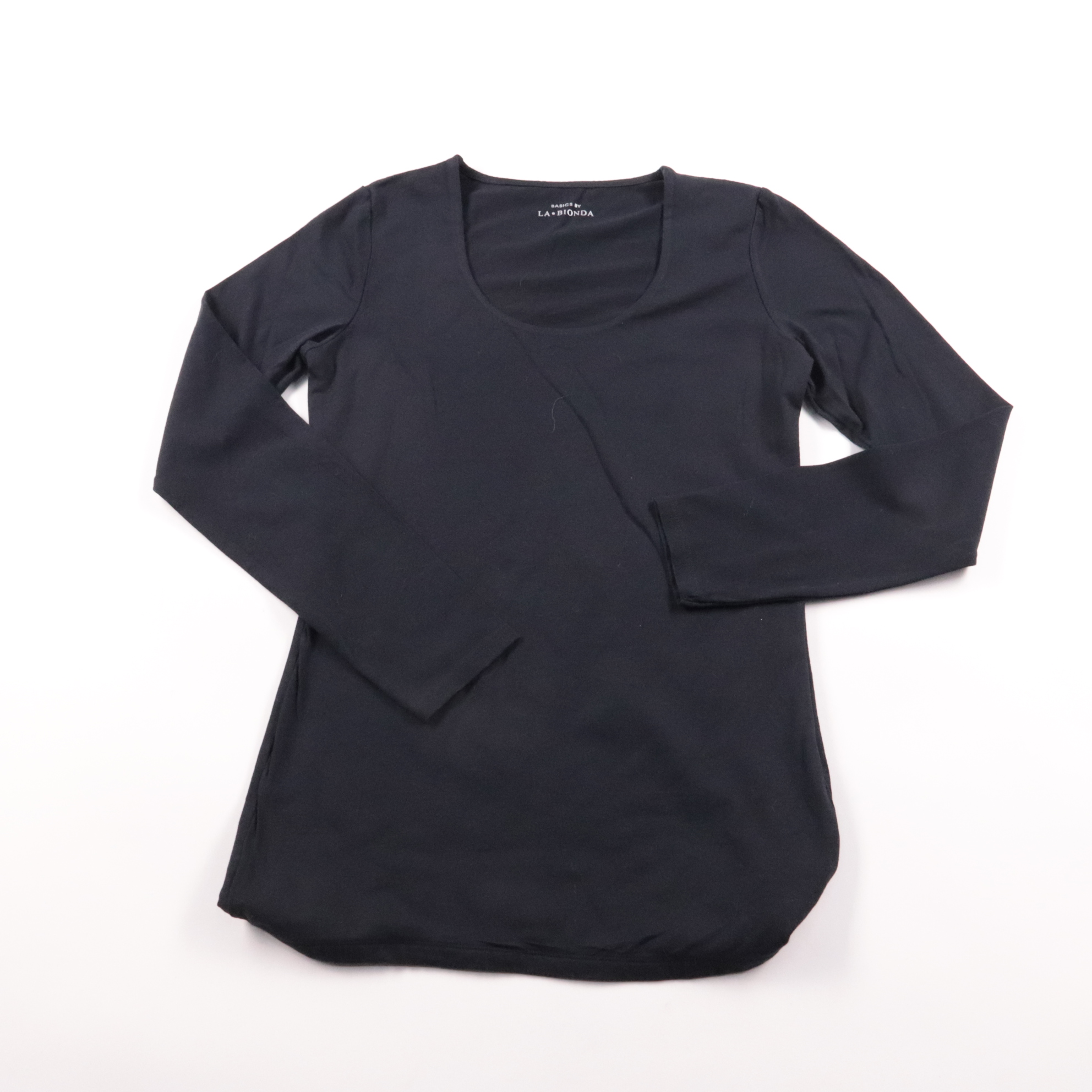 Чёрный лонгслив Basics by La Bionda с округлым вырезом и длинным рукавом. Подойдёт для повседневных образов и как базовый слой под жакет или кардиган. Мягкая хлопково-модальная ткань с эластаном хорошо тянется и комфортно сидит.