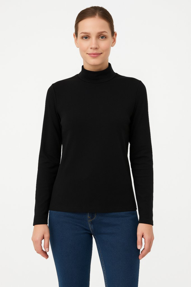 Чёрный лонгслив с воротником-стойкой, базовая вещь для повседневных образов и офиса. Хорошо сочетается с джинсами, юбками и пиджаком, можно носить как самостоятельный верх или первым слоем. Практичный цвет и лаконичный крой легко вписываются в гардероб.