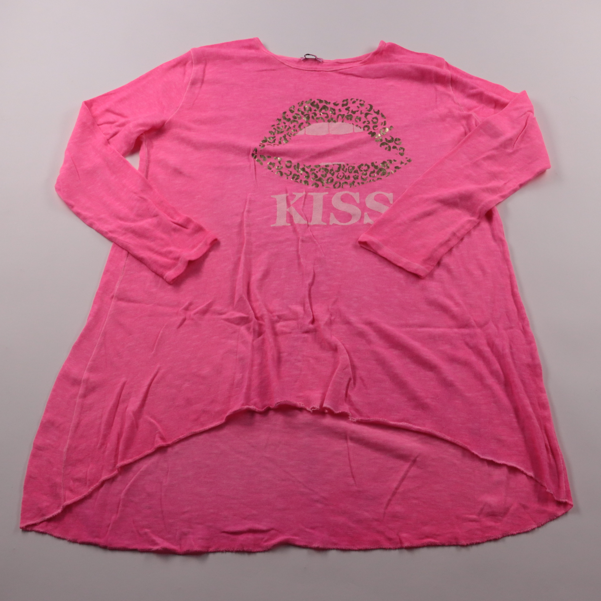 Розовый лонгслив New Collection свободного кроя с принтом губ и надписью KISS. Подойдёт для повседневных образов и дома, хорошо сочетается с джинсами или леггинсами. Мягкий трикотаж комфортно носится и не сковывает движения.