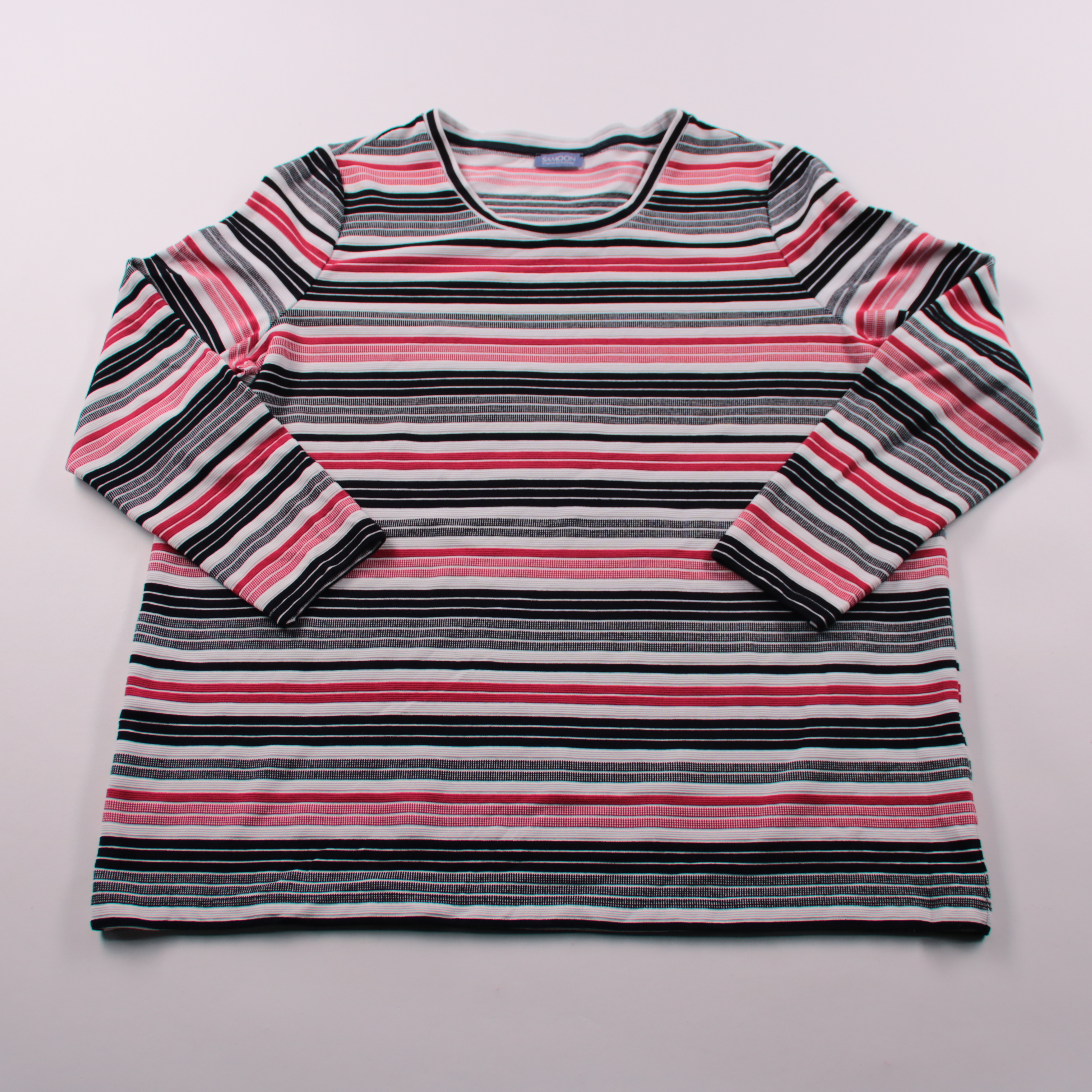 Лонгслив Samoon в разноцветную горизонтальную полоску (чёрный/белый/розово-красный), мягкий трикотаж. Подойдёт для повседневных образов и офиса в стиле casual, хорошо сочетается с джинсами и однотонными брюками. Практичный плюс — рукава и низ не стесня...