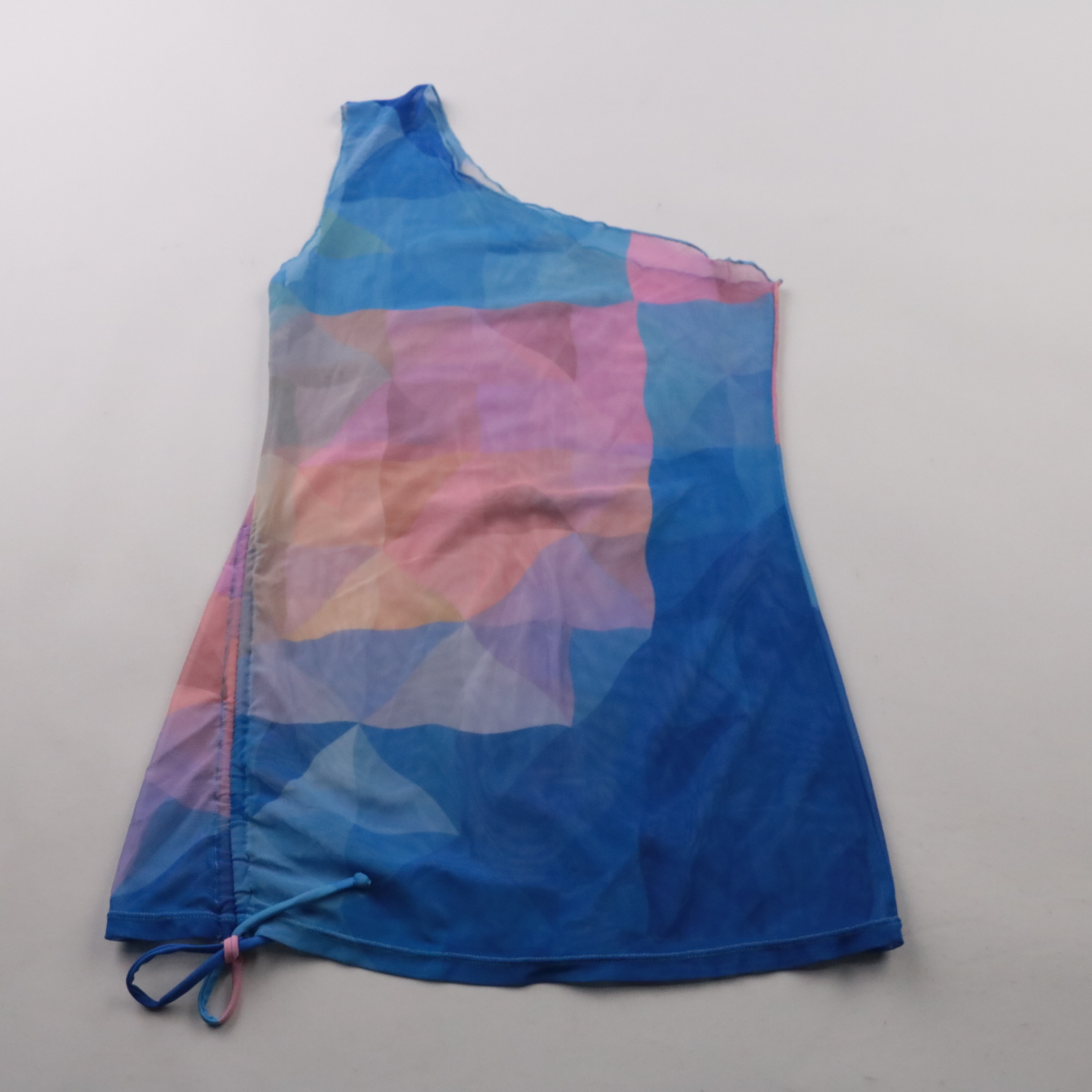 Женский топ на одно плечо с ярким геометрическим принтом в сине-розовой гамме и боковой шнуровкой. Подойдёт для летних прогулок, отпуска или вечеринки, легко сочетается с джинсами и юбками. Эластичная сетчатая ткань хорошо тянется и быстро сохнет.