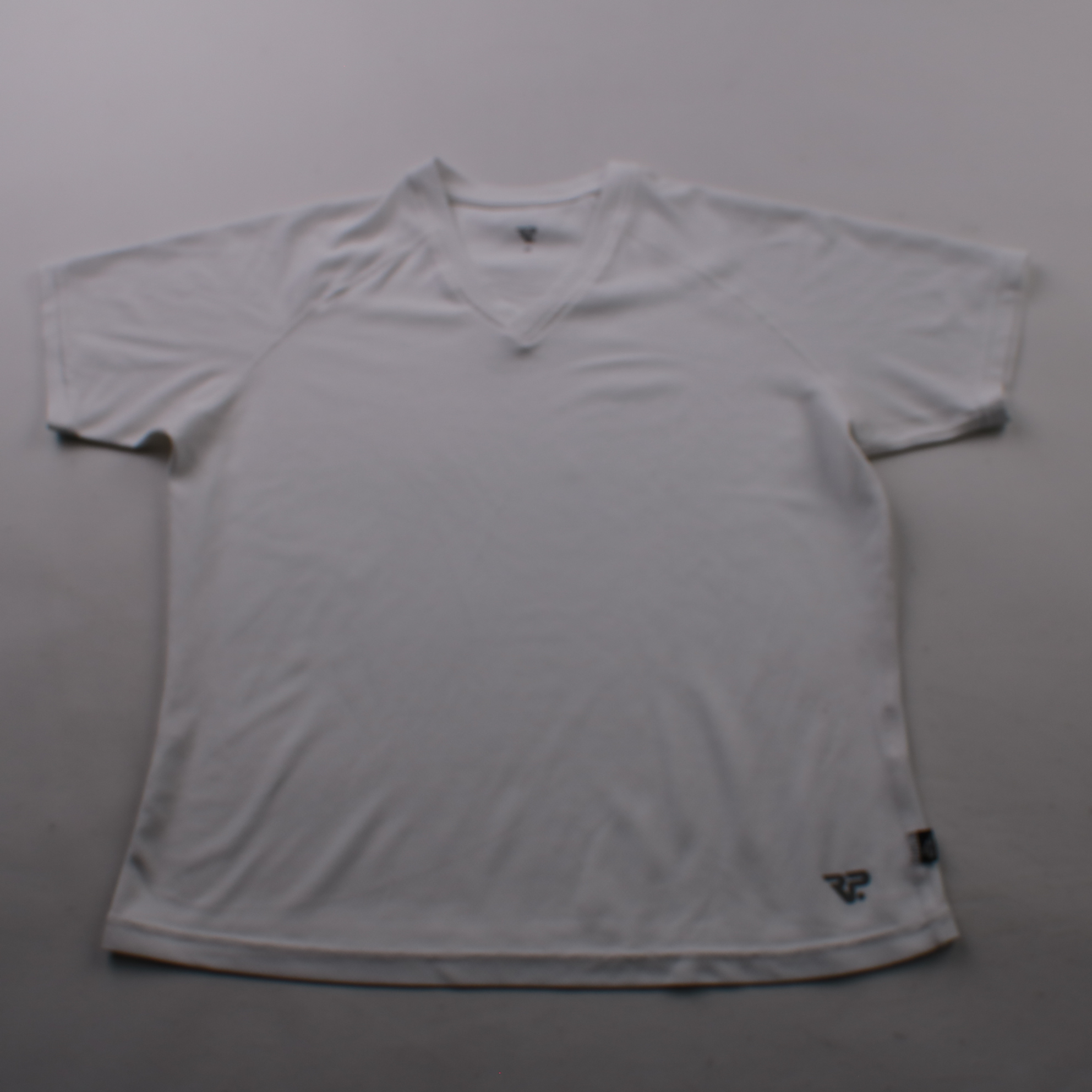 Мужская белая футболка R.P. с V-образным вырезом и лёгкой спортивной фактурой ткани. Подойдёт для тренировок и активных прогулок в тёплую погоду, быстро сохнет и хорошо пропускает воздух.