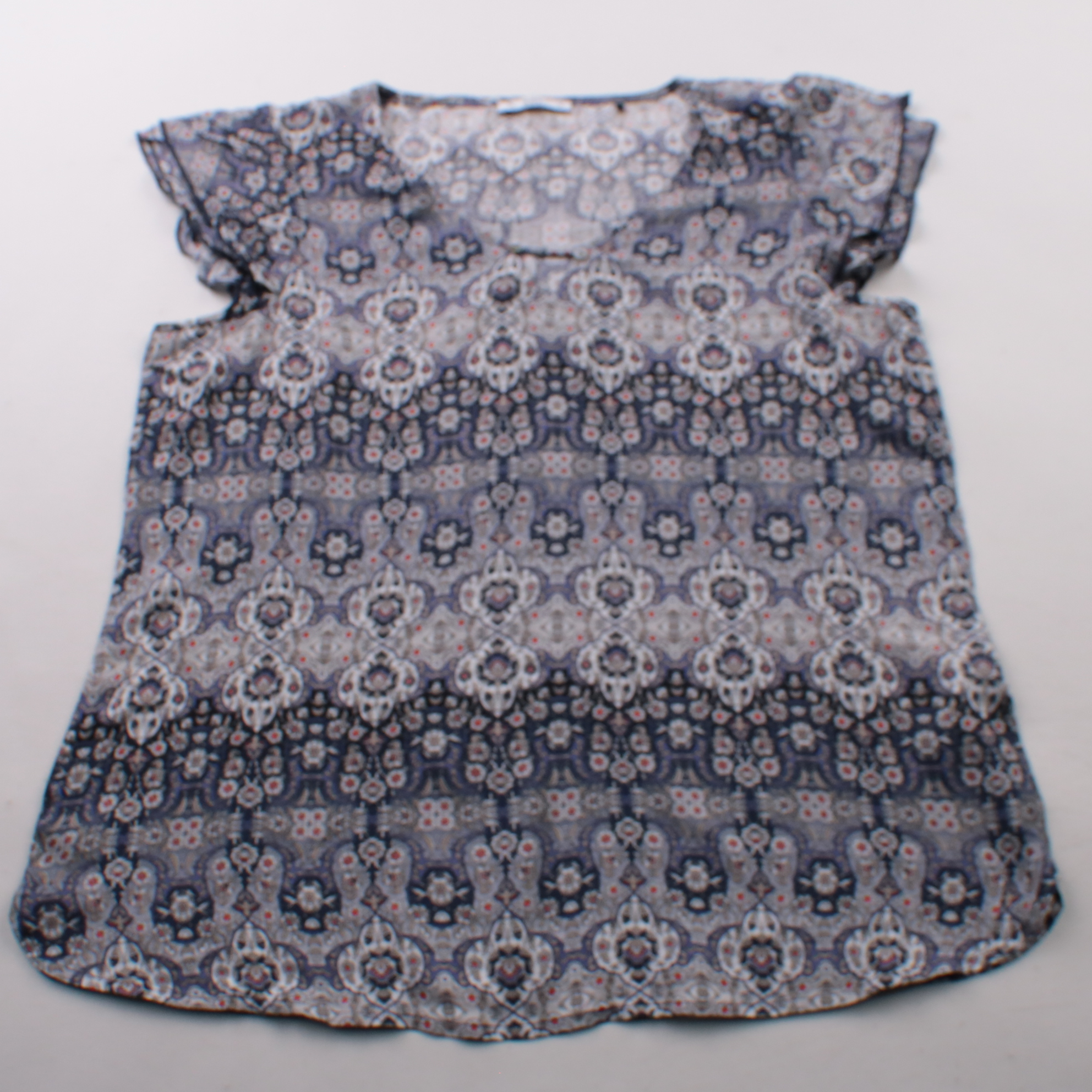 Лёгкая блузка Esprit edc из вискозы с короткими рукавами и узорчатым принтом в сине-серой гамме. Подойдёт для лета и тёплой весны, легко сочетается с джинсами или юбкой. Вискоза дышит и приятна к телу, удобно носить в жару.