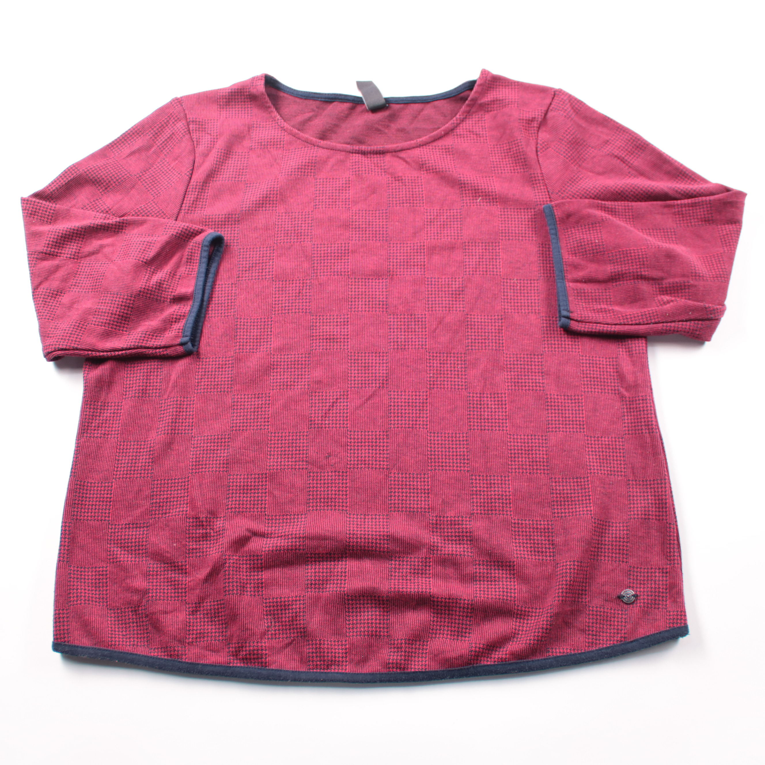 Лонгслив Multiblu бордового цвета в мелкую клетку, с круглым вырезом и контрастной окантовкой. Подойдёт для повседневных образов в офис или на прогулку, хорошо сочетается с джинсами и однотонными брюками. Ткань с вискозой и эластаном мягко тянется и ко...