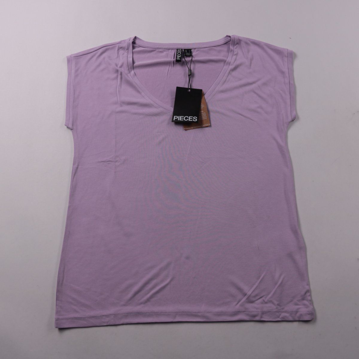 Женская футболка Pieces лавандового оттенка с V-образным вырезом и коротким рукавом. Подойдёт для повседневных образов и как базовый слой под жакет или кардиган. Модальный трикотаж мягкий и приятный к телу, ткань проста в уходе.