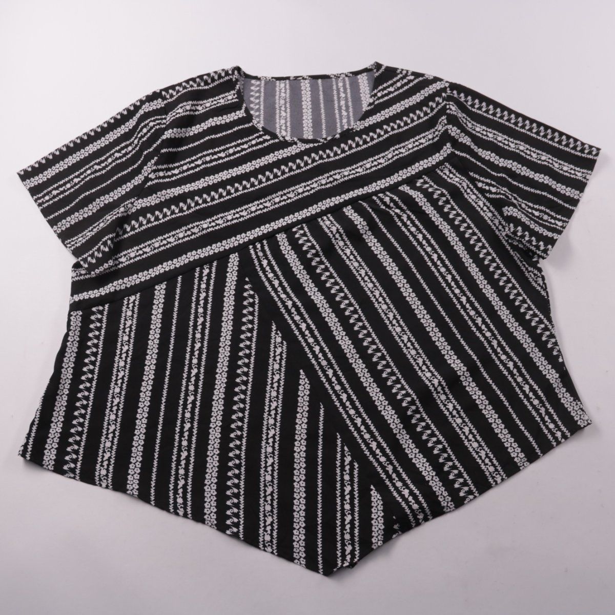 Женский топ свободного кроя с V-образным вырезом и коротким рукавом, без бренда. Чёрно-белый геометрический принт подойдёт для повседневных образов и отдыха в тёплую погоду. Ткань из полиэстера проста в уходе и быстро сохнет.