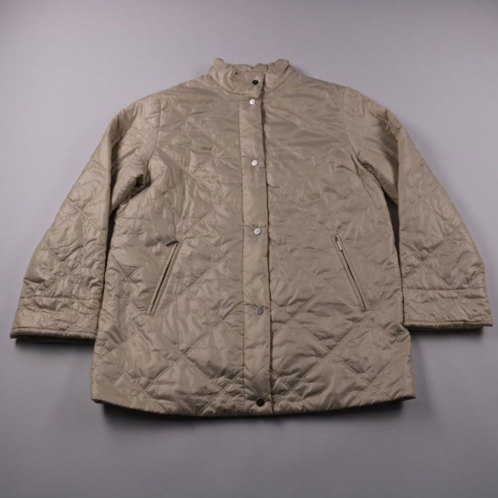 Стёганая демисезонная куртка в бежевом цвете с воротником-стойкой и застёжкой на кнопки. Подойдёт для повседневных прогулок и поездок в прохладную погоду, легко сочетается с базовым гардеробом. Практичный плюс — лёгкая, с карманами на молнии и утеплённ...