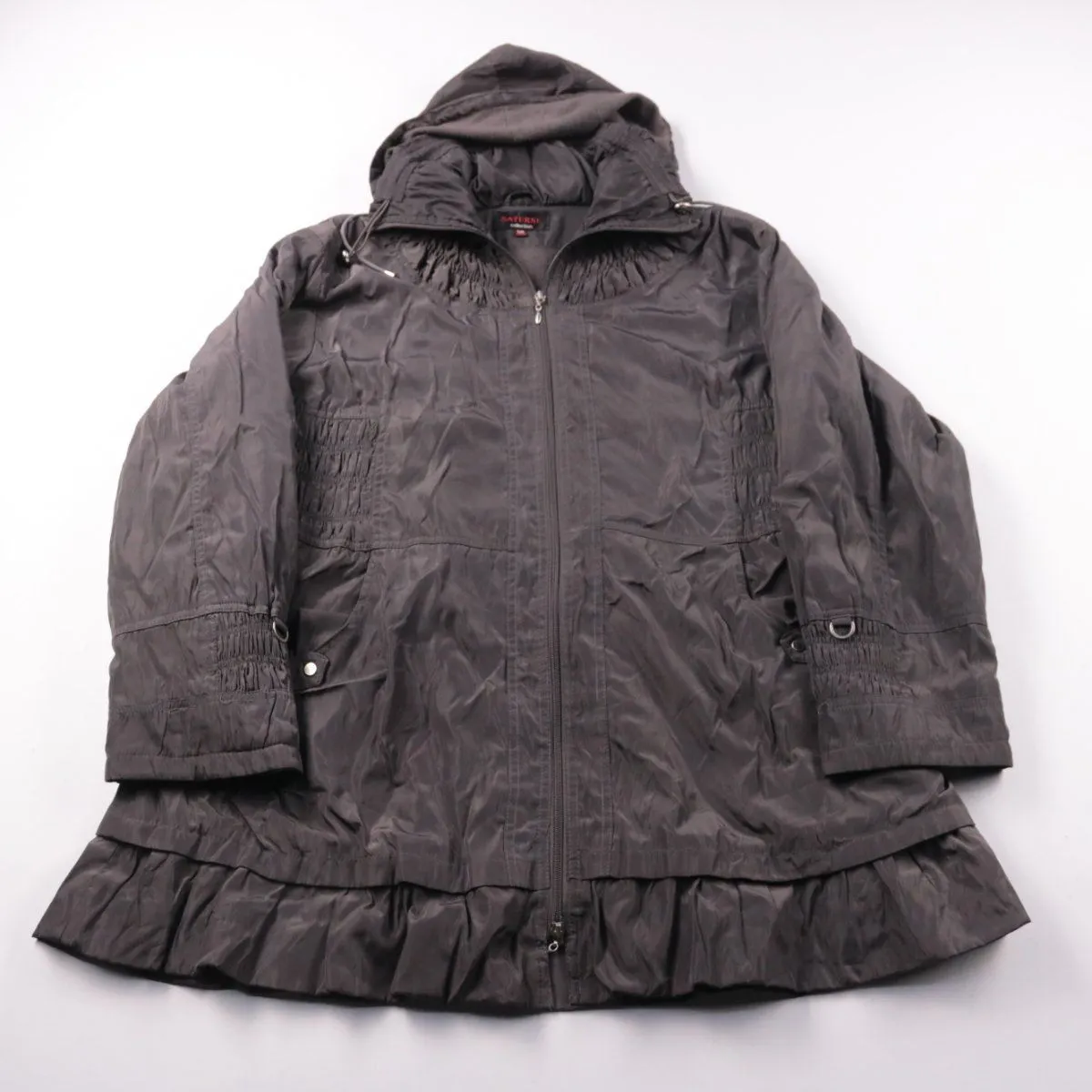 Женская демисезонная куртка Saturne с капюшоном и застёжкой на молнию, низ оформлен аккуратной оборкой. Подойдёт для повседневных прогулок в прохладную погоду и в межсезонье. Практичная ткань легко чистится и защищает от ветра.