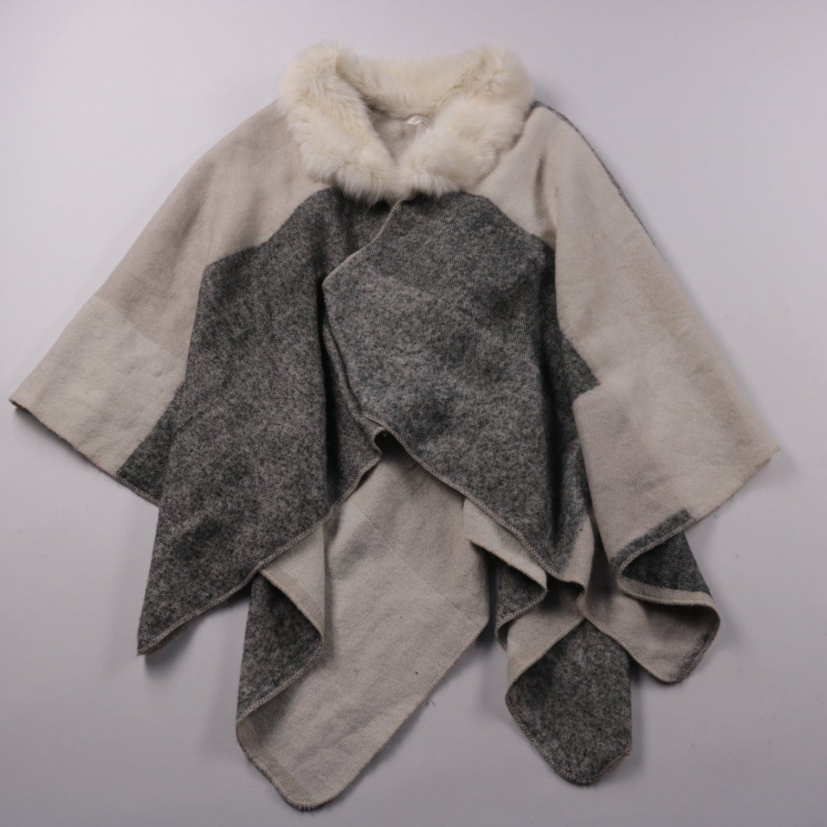 Женское пончо Selfridge в серо-бежевой гамме с воротником из искусственного меха. Подойдёт для прохладной осени и весны, удобно накидывается поверх свитера и не стесняет движения. Практично тем, что легко сочетается с джинсами и платьями и быстро добавляет тепла образу.