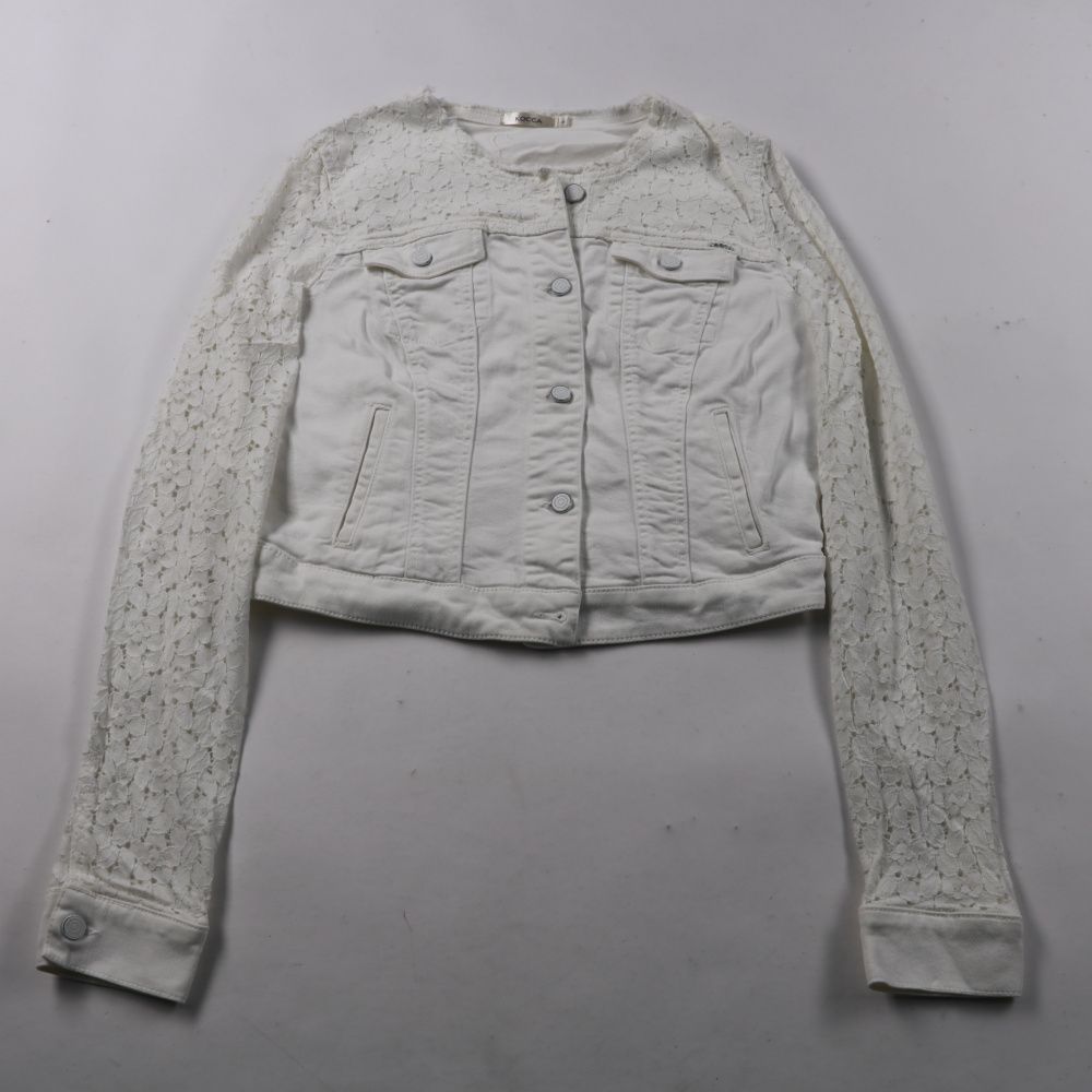 Укороченная женская куртка Kocca белого цвета, выполнена в стиле джинсовки с кружевными рукавами. Подойдёт для весны/осени и прохладных летних вечеров, хорошо смотрится с платьями и джинсами. Застёгивается на кнопки и имеет карманы, удобно для повседне...