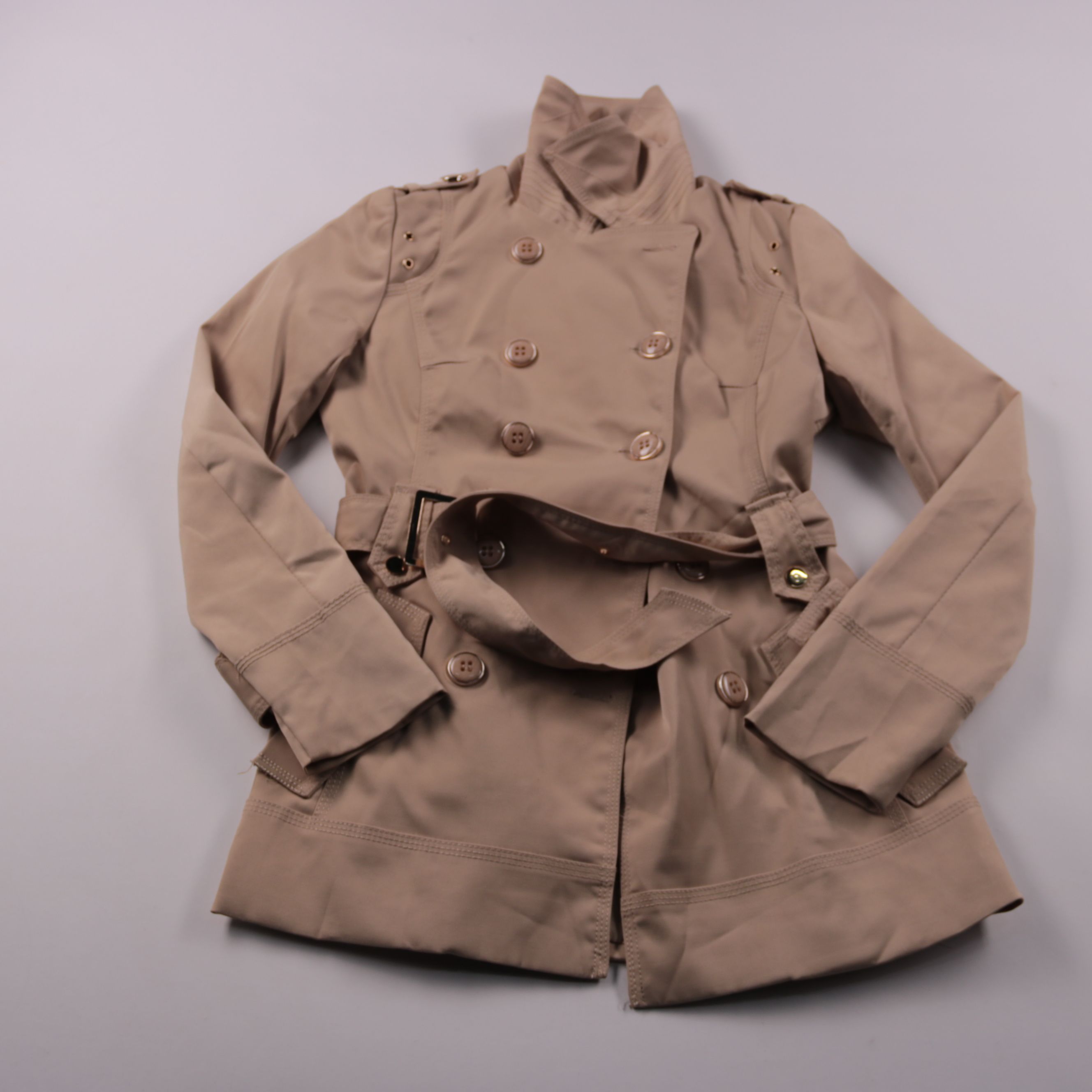Двубортный женский тренч-плащ бежевого цвета с поясом и отложным воротником-стойкой. Подойдёт для весны и осени, хорошо сочетается с повседневными и офисными образами. Пояс позволяет регулировать посадку по талии, а плотная ткань защищает от ветра.