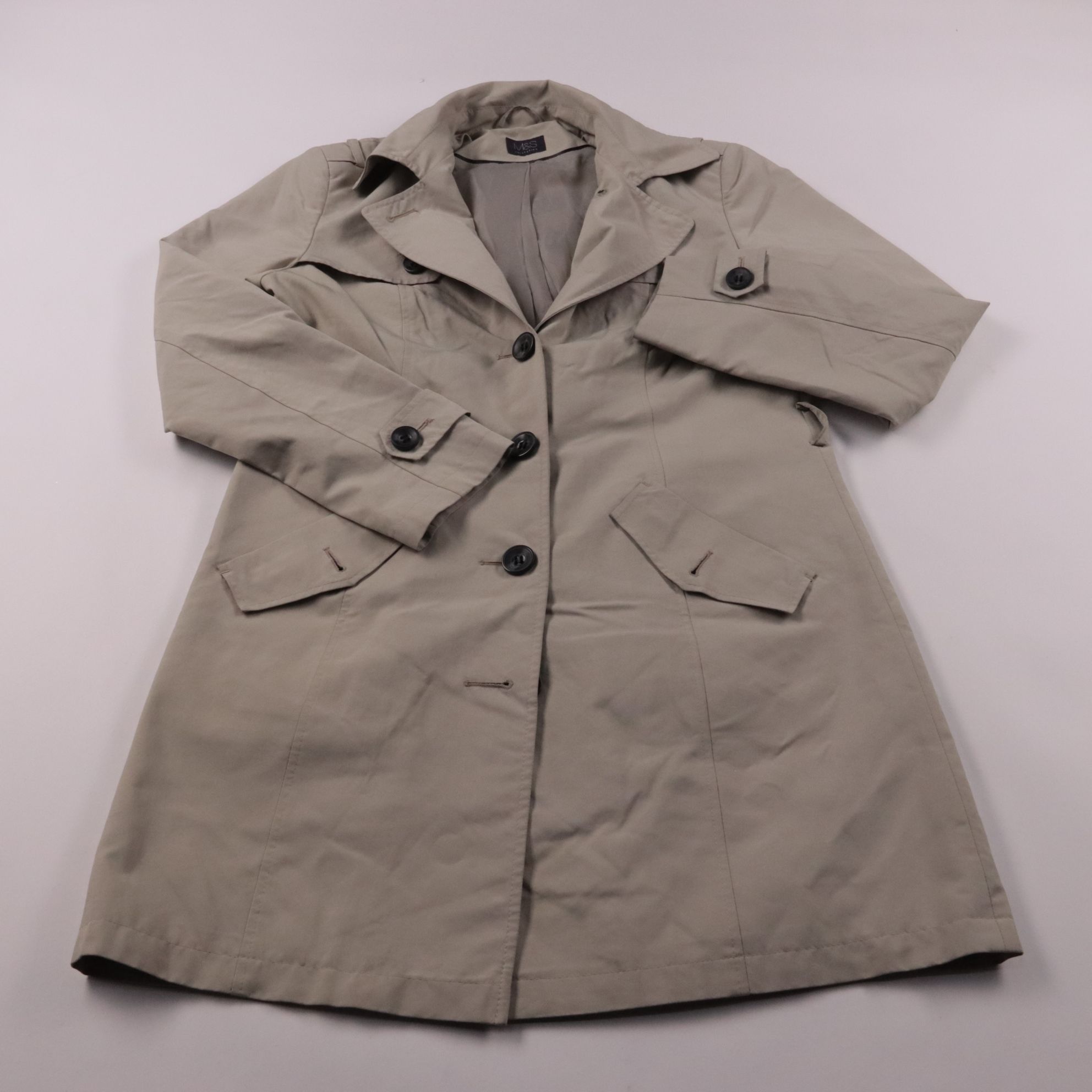 Женский тренч M&S Collection в бежевом оттенке pebble, на пуговицах, с отложным воротником и клапанами карманов. Подойдёт для весны и осени, легко сочетается с повседневными и офисными образами. Практичный плюс — лёгкий полиэстер и простота в уходе (ст...