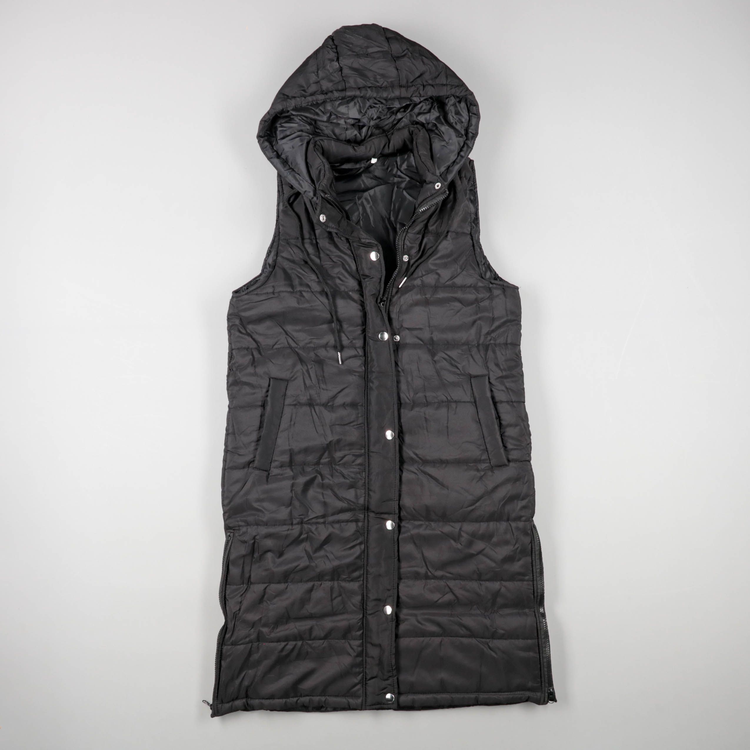 Утеплённый стёганый жилет с капюшоном, бренд не указан. Подойдёт для прохладной погоды и удобен для многослойных образов на прогулки или в поездки. Практичные карманы и застёжка на молнию с кнопками помогают лучше защищать от ветра.