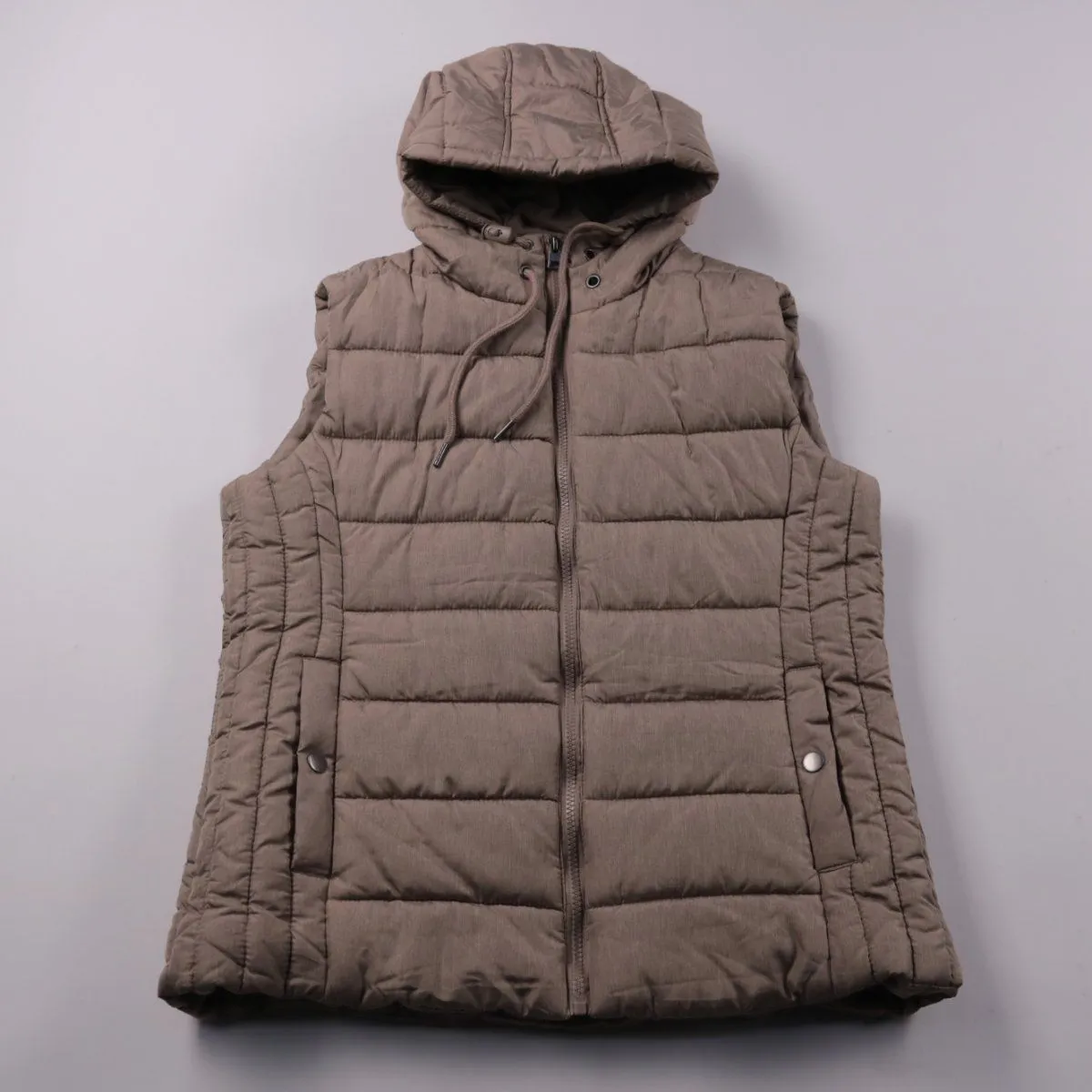 Стёганый утеплённый жилет ever.me с капюшоном, на молнии и с карманами на кнопках. Подойдёт для прохладной осени/весны и для многослойных образов поверх худи или свитера. Лёгкий и удобный в носке, хорошо защищает корпус от ветра.