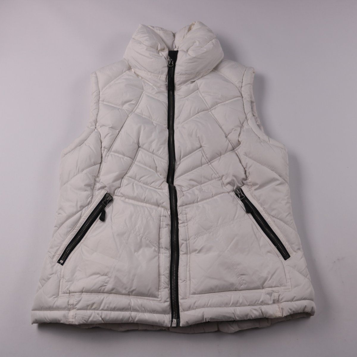 Стёганый утеплённый жилет Human Nature молочного оттенка с высоким воротником и застёжкой на молнию. Подойдёт для прогулок в прохладную погоду и как дополнительный слой под куртку. Практичное преимущество — боковые карманы на молниях.