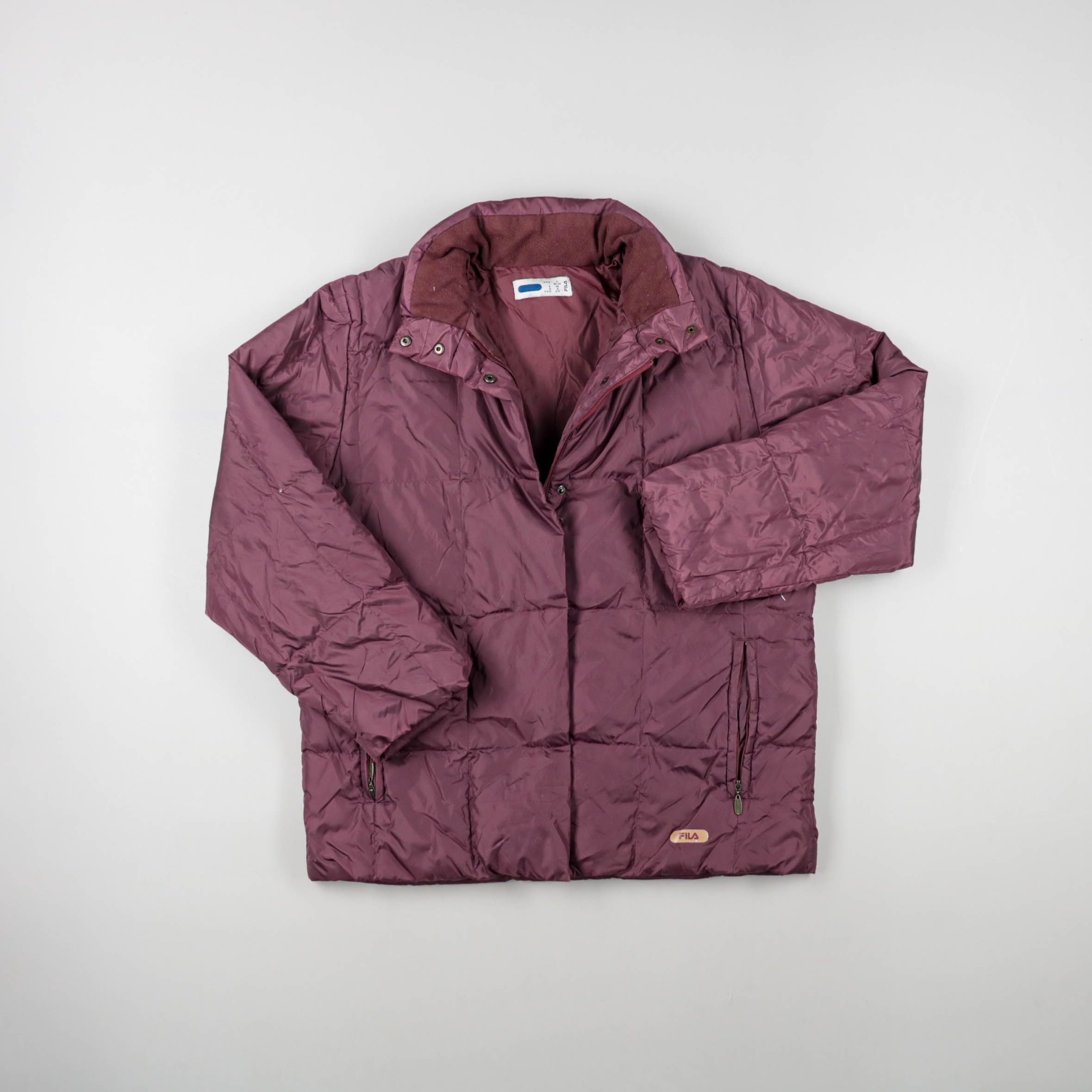 Мужской пуховик Fila в бордовом цвете, стёганый, с высоким воротником и застёжкой на молнию/кнопки. Подойдёт для зимних прогулок и повседневной носки в городе. Практичный плюс — карманы на молнии, удобно хранить телефон и ключи.