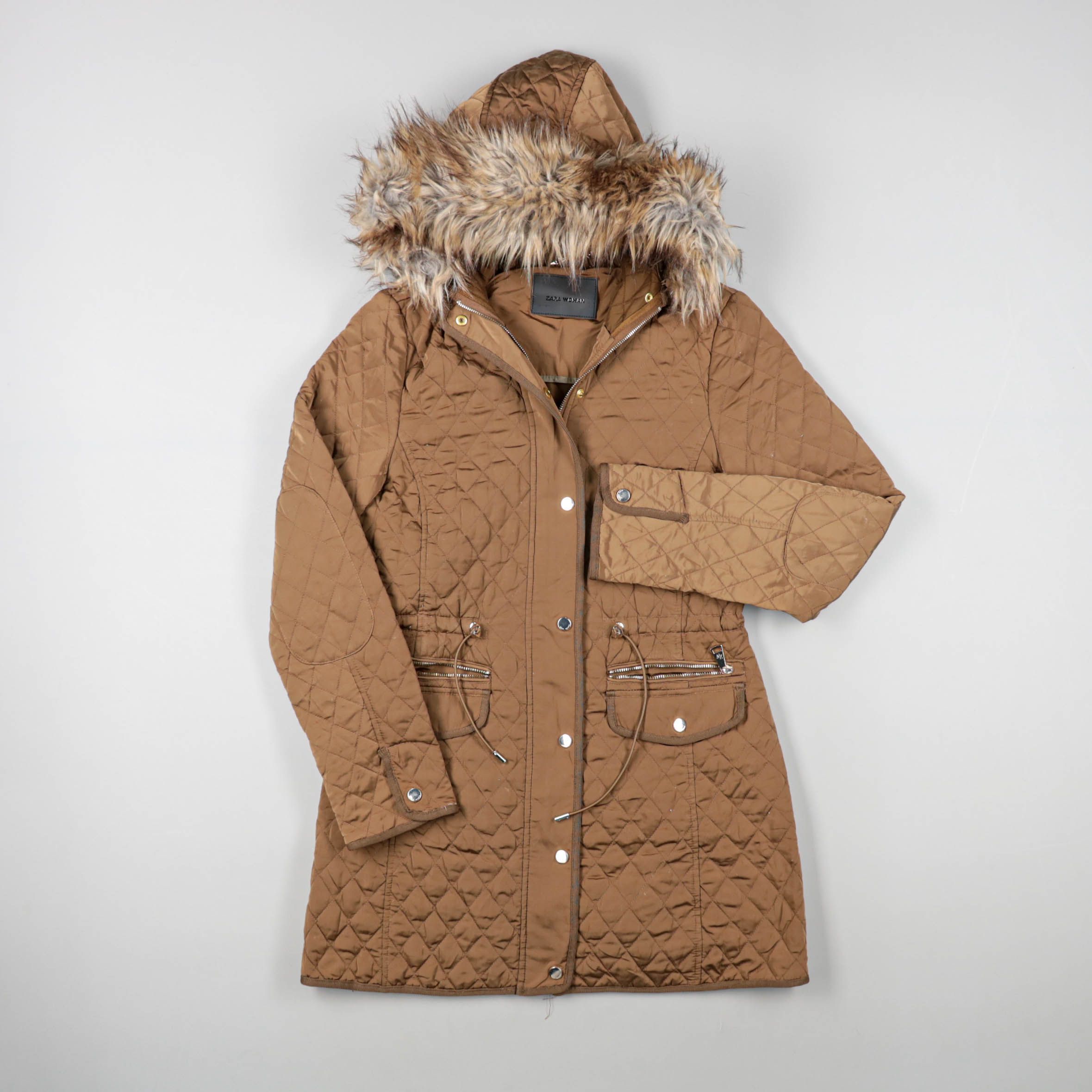 Стёганая зимняя куртка Zara с капюшоном и опушкой из искусственного меха. Подойдёт для повседневной носки в холодную погоду и поездок по городу. Утяжка на талии помогает регулировать посадку, а карманы на молнии удобны для мелочей.