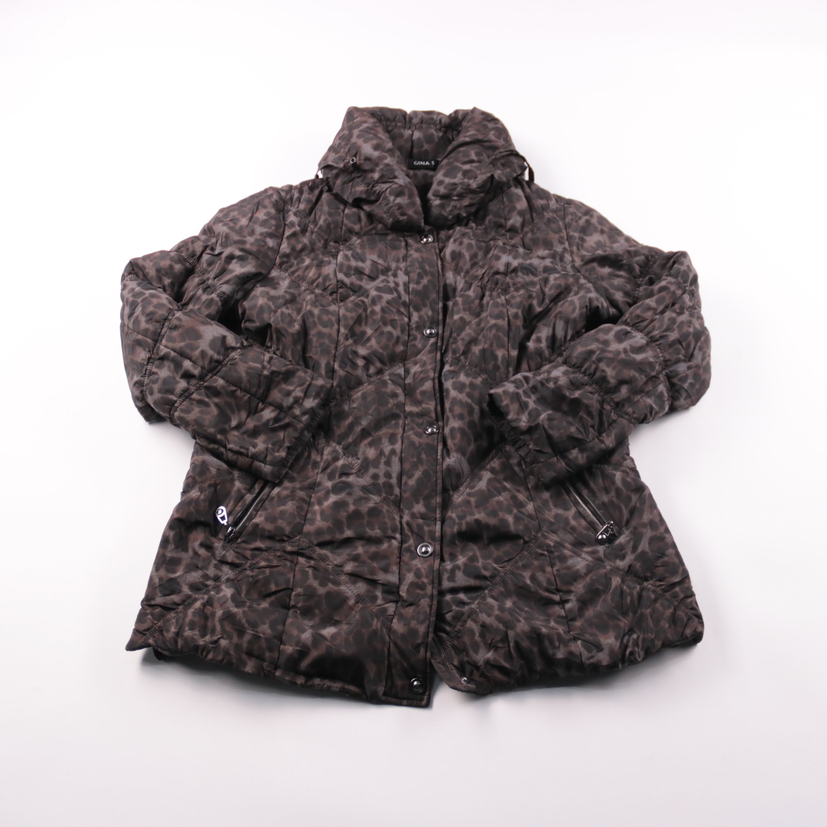 Женская зимняя куртка Gina S с леопардовым принтом и высоким воротником. Подойдёт для повседневных прогулок и поездок в холодную погоду. Утеплитель и подкладка из полиэстера, есть удобные карманы на молниях.