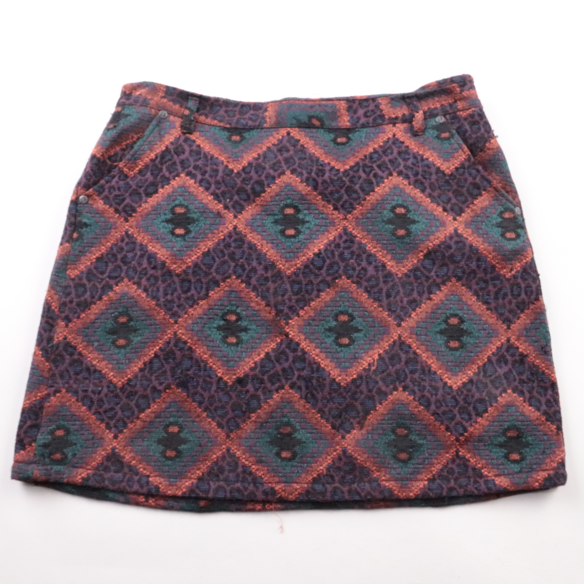 Юбка Indigo (M&S) из плотной жаккардовой ткани с геометрическим узором в ромбы. Подойдёт для повседневных образов в демисезон: с водолазкой, рубашкой или свитером. Есть подкладка, поэтому юбка комфортно сидит и меньше просвечивает.