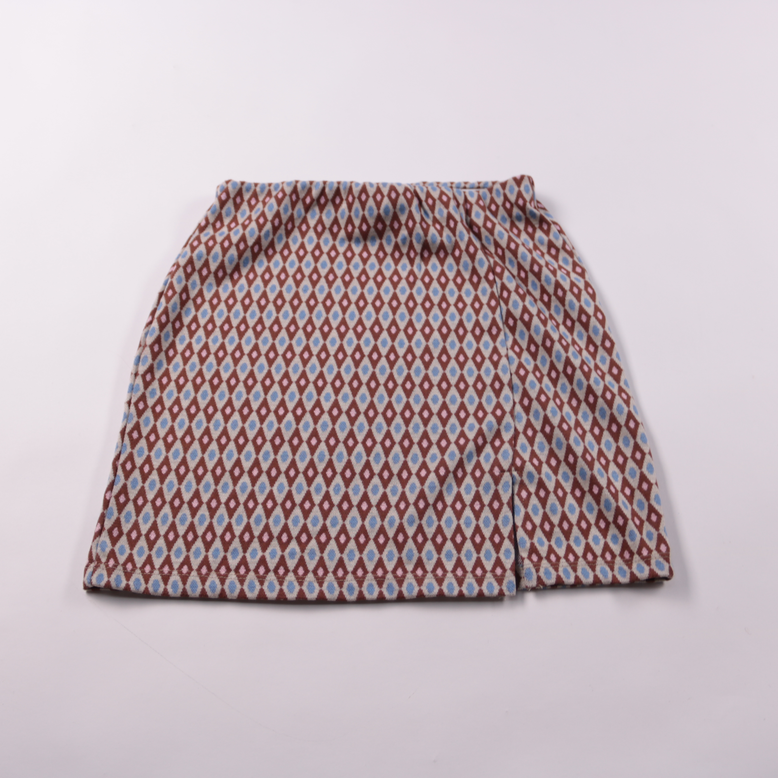 Юбка Primark с геометрическим принтом ромбами в бордово-голубых оттенках. Подойдёт для летних прогулок и повседневных образов с однотонным верхом. Лёгкая ткань и компактная длина удобны в носке и не сковывают движения.