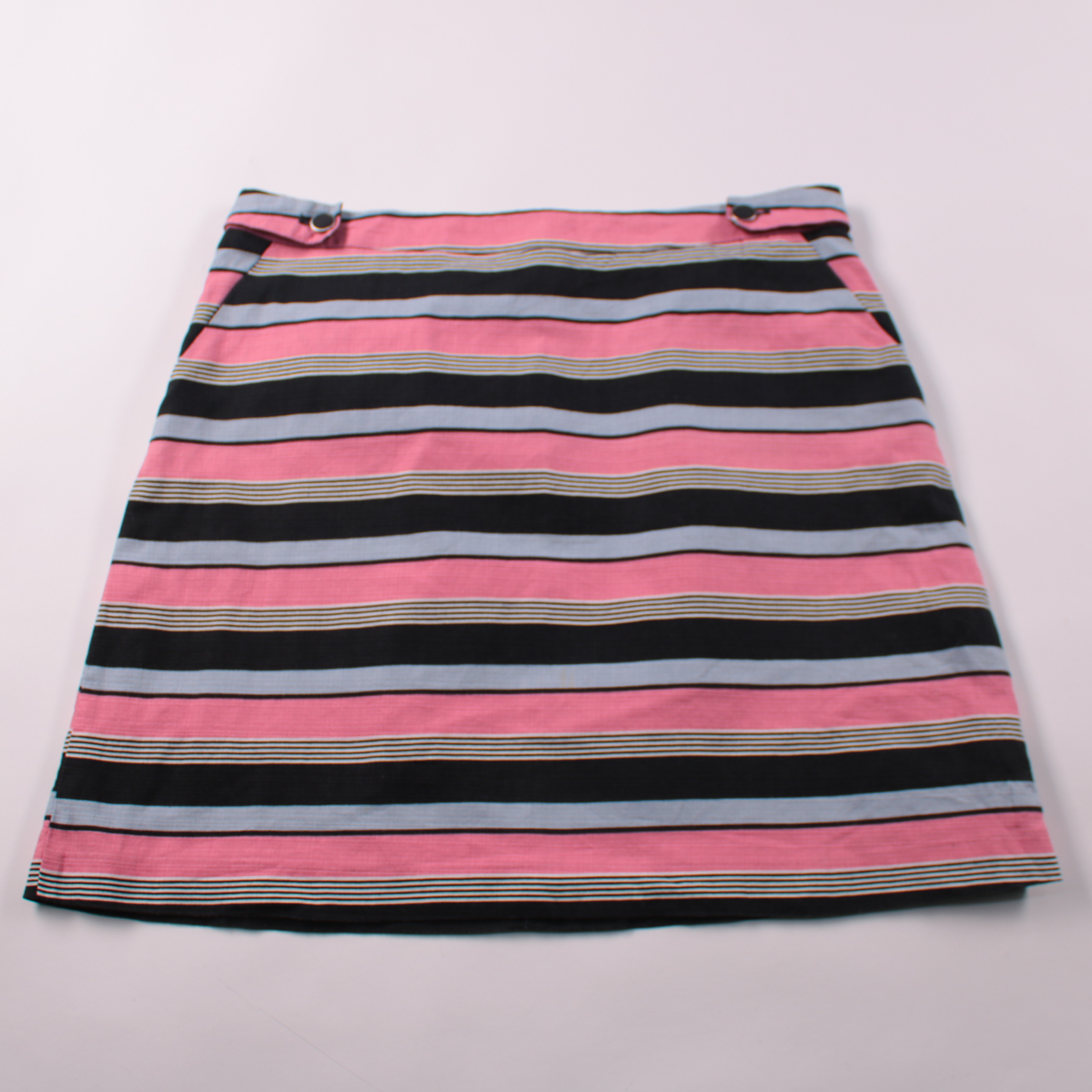 Юбка Oasis в разноцветную горизонтальную полоску (розовый, чёрный, серо-голубой и тонкие бежевые линии). Подойдёт для летних прогулок и повседневных образов с однотонным топом или рубашкой. Лёгкая ткань и подкладка делают посадку аккуратной и комфортной.