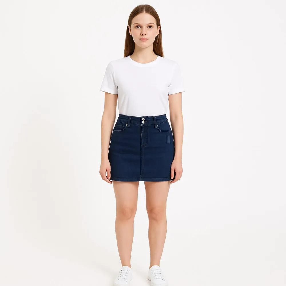 Джинсовая юбка Tally Weijl тёмно-синего цвета с высокой посадкой и застёжкой на пуговицы спереди. Подойдёт для повседневных образов в городе, легко сочетается с футболками, рубашками и кедами. Плотный деним хорошо держит форму и комфортно носится.
