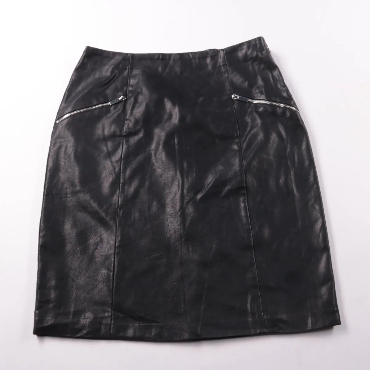 Юбка New Look из экокожи чёрного цвета с декоративными молниями спереди. Подойдёт для повседневных образов и вечерних выходов в прохладную погоду. Материал практичный — легко протирается и держит форму.
