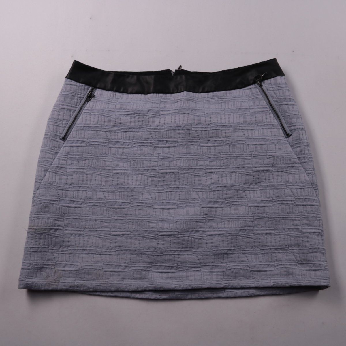 Юбка Steps серого цвета с фактурной тканью и чёрным поясом, спереди декоративные молнии. Подойдёт для повседневных и офисных образов с блузой или свитером. Плотный материал держит форму и выглядит аккуратно.